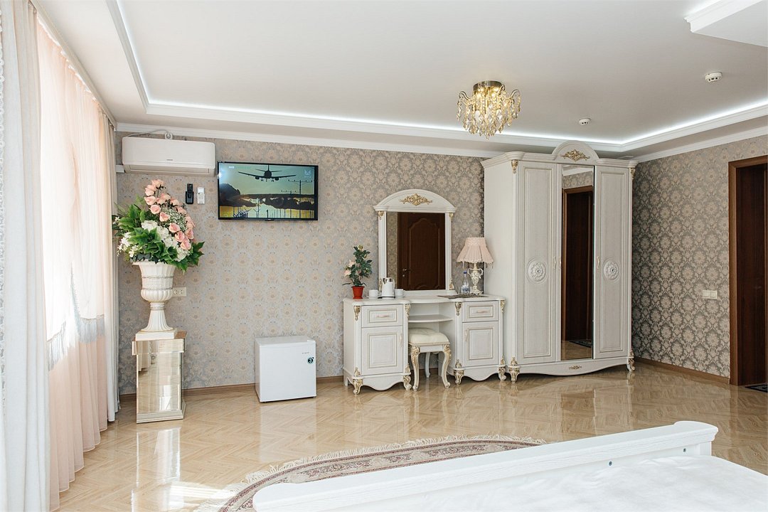 телевизор, спутниковое телевидение, Wi-Fi, интернет, кондиционер, фен, санузел, тапочки, двуспальная кровать, шкаф для одежды, вешалки, письменный стол, багажная тумба, зеркало, унитаз, раковина, питьевая вода, обеденная зона, гостиная зона, душ, кресло, вид во двор, ламинат, туалетный столик, туалетные средства, туалет, номер для некурящих, пуфик, антибактериальное средство для рук, уборка номера, набор для приготовления чая и кофе, вешалки-плечики, бутилированная водаВ номере