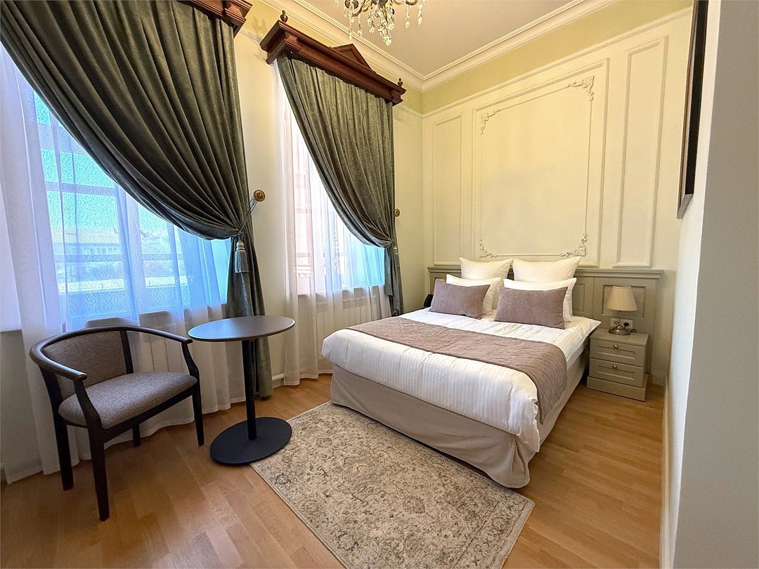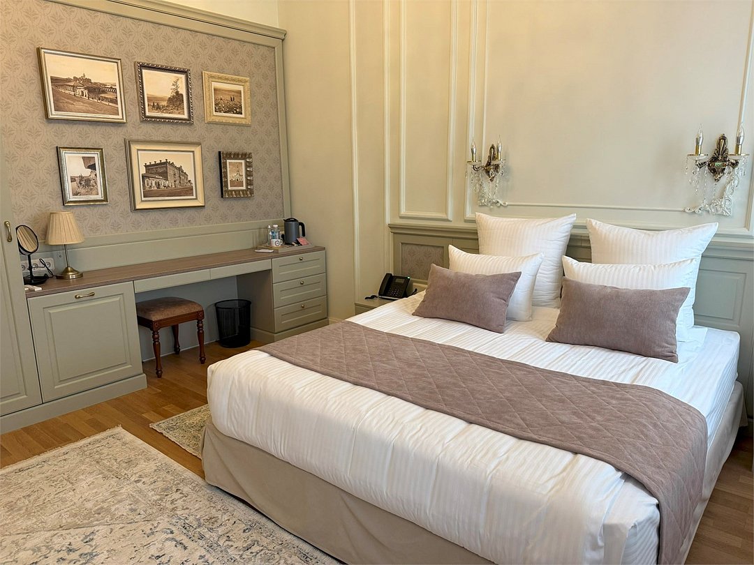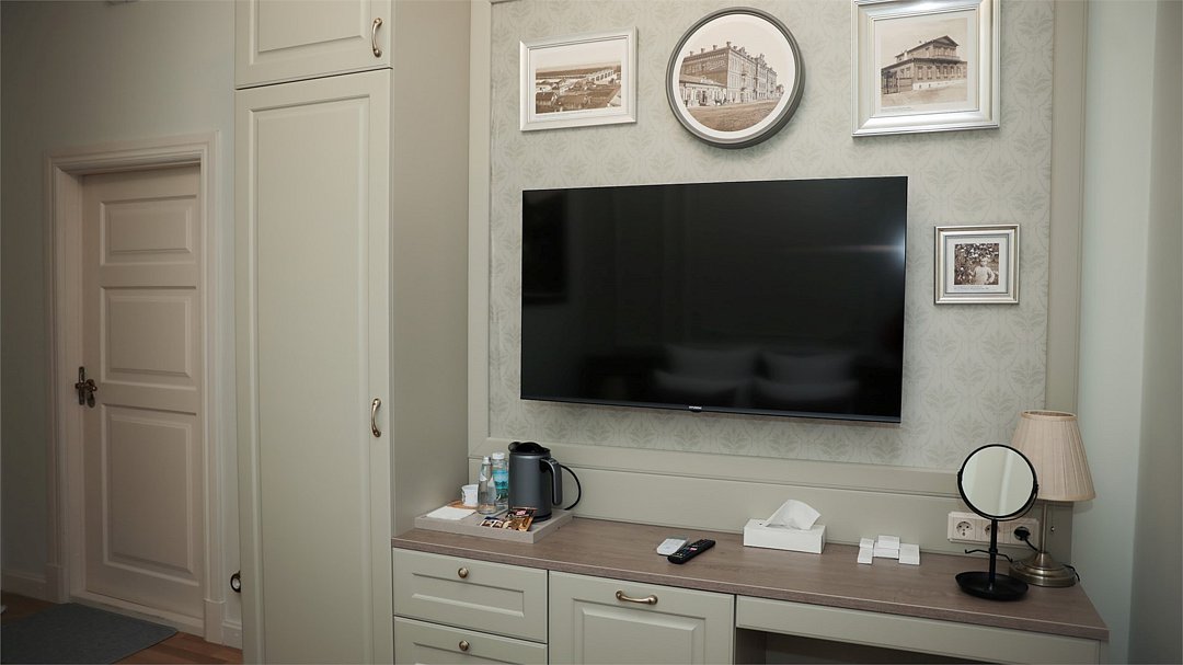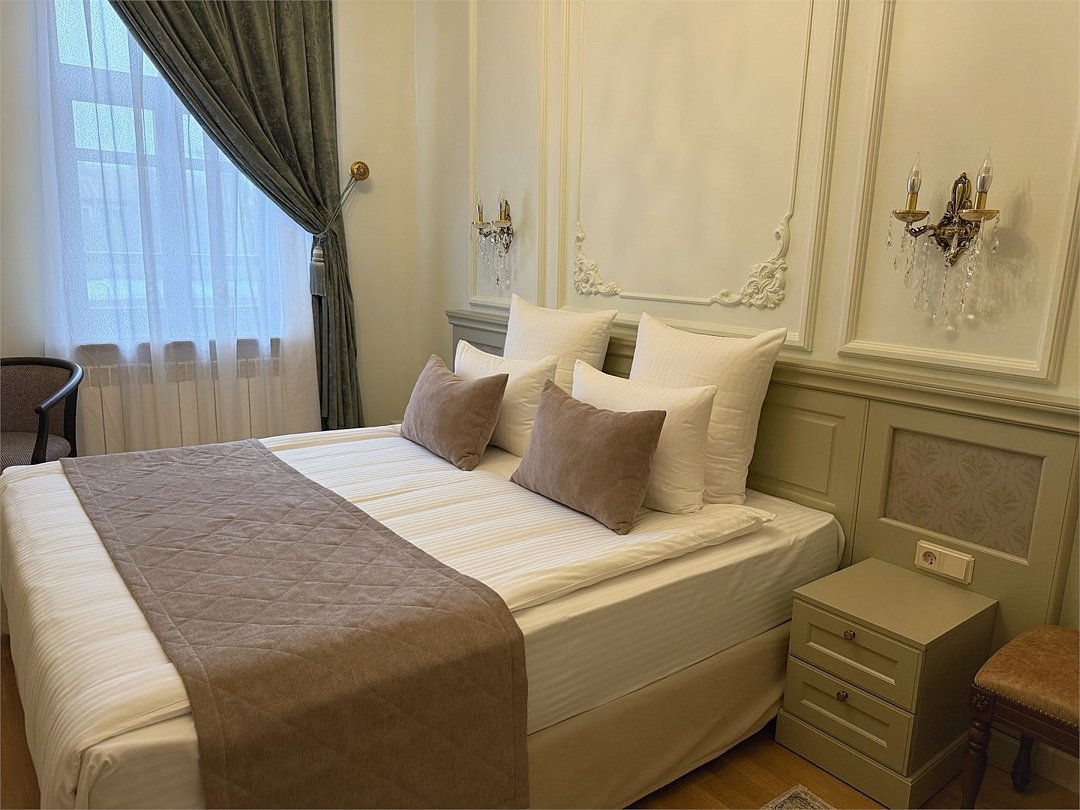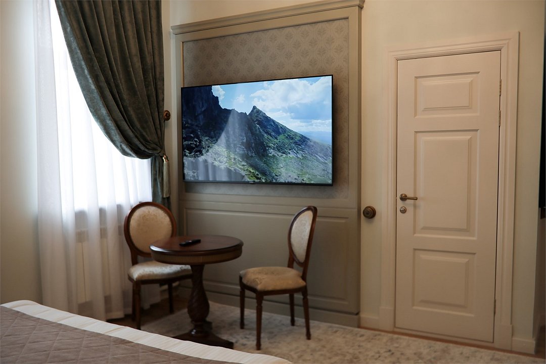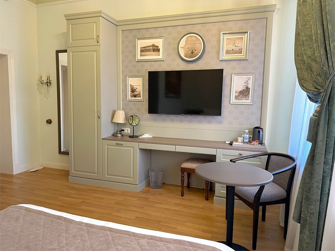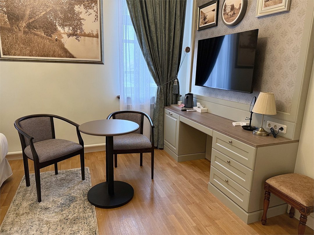 телевизор, Wi-Fi, телефон, кондиционер, светильник, фен, ванная комната, халаты, тапочки, косметические средства, двуспальная кровать, стулья, вешалки, зеркало, эксклюзивная мебель, сейф, унитаз, раковина, душ, вид на город, вид во двор, стаканы, стол, цифровое тв, мини-холодильник, чайная станция, уборка номера, бутилированная водаВ гостиничном номере