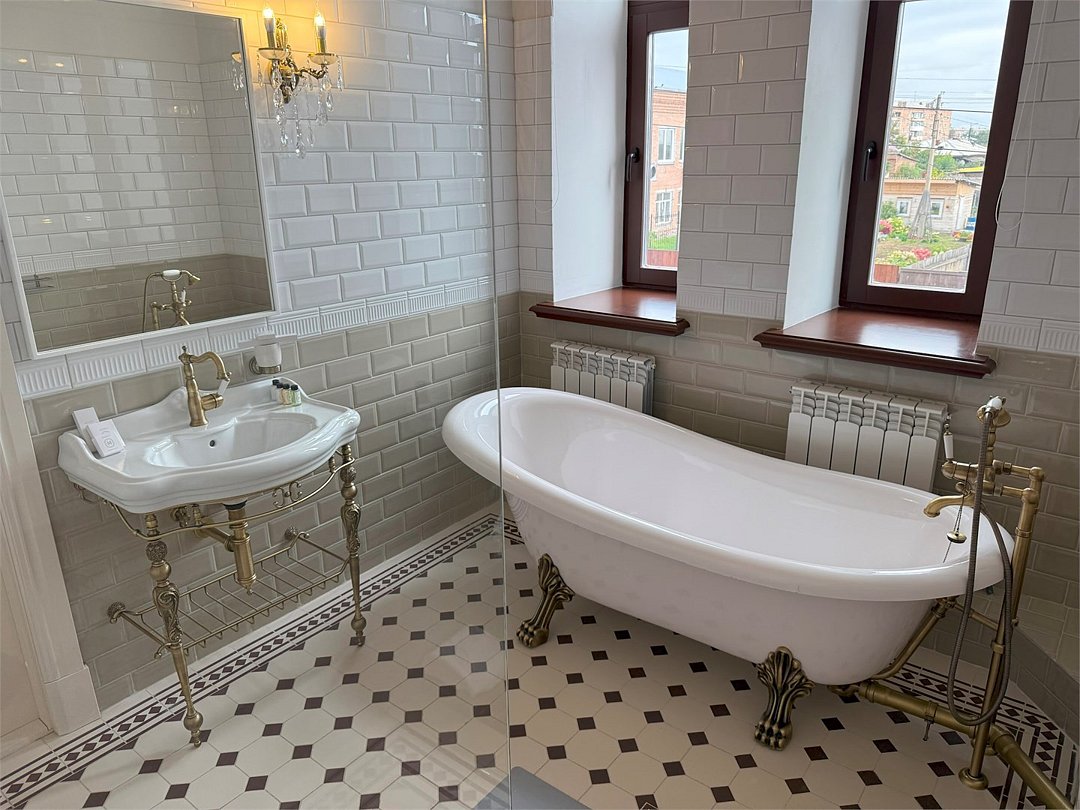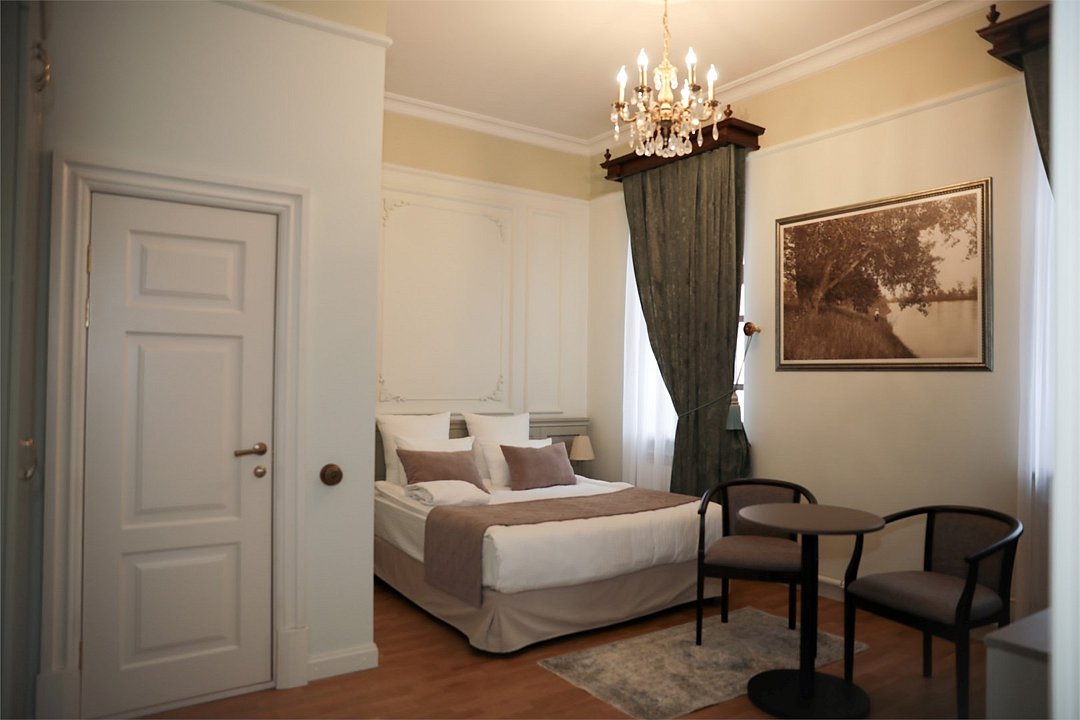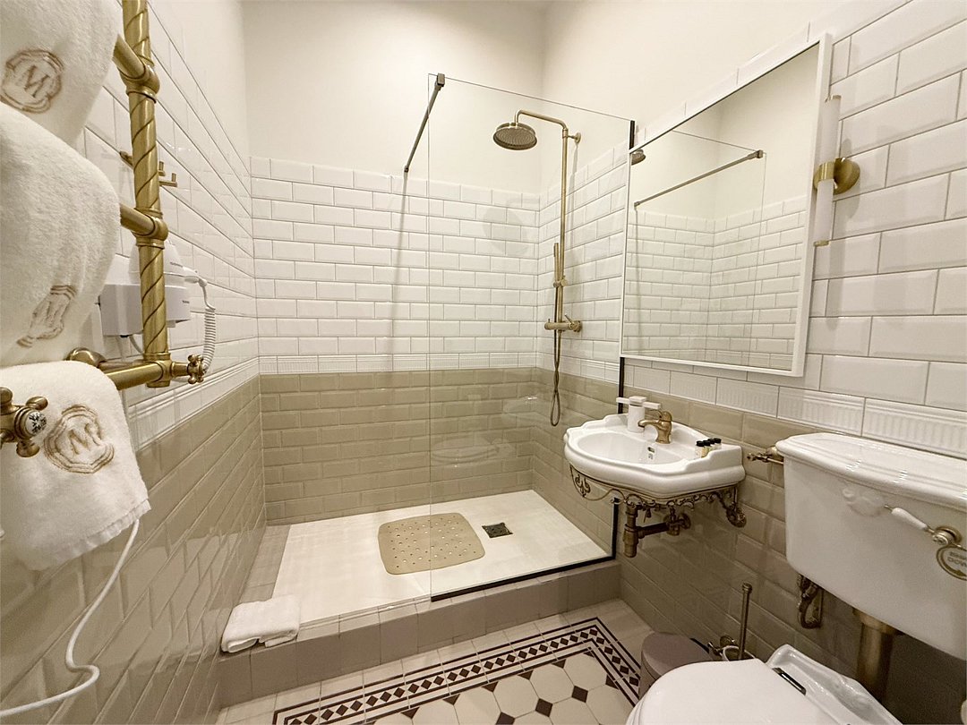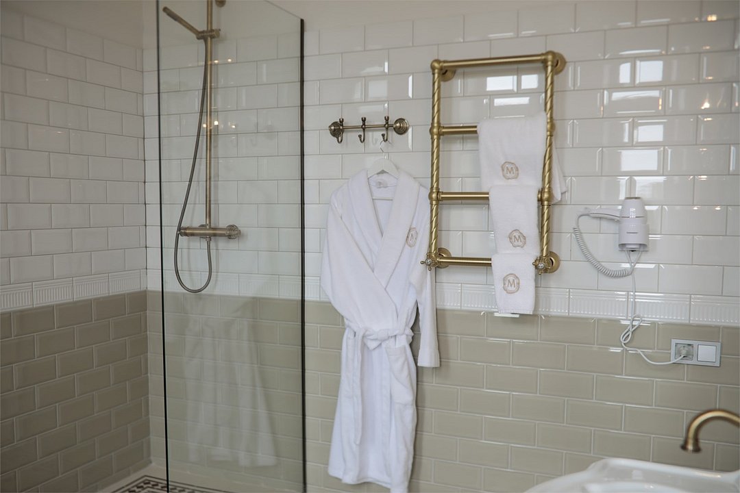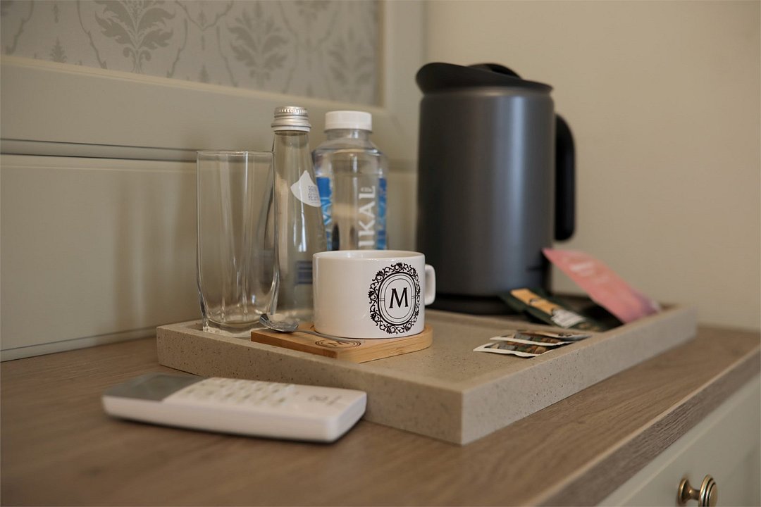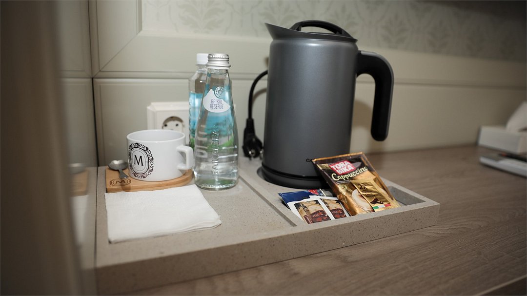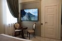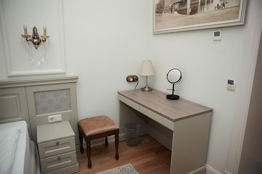 телевизор, Wi-Fi, телефон, кондиционер, светильник, фен, ванная комната, халаты, тапочки, косметические средства, двуспальная кровать, стулья, вешалки, зеркало, эксклюзивная мебель, сейф, унитаз, раковина, душ, вид на город, вид во двор, стаканы, стол, цифровое тв, мини-холодильник, чайная станция, уборка номера, бутилированная водаВ гостиничном номере