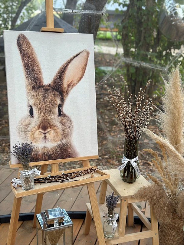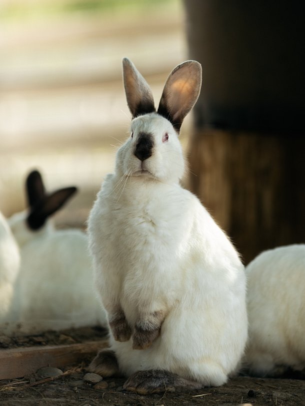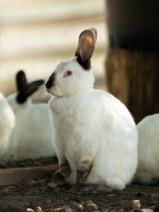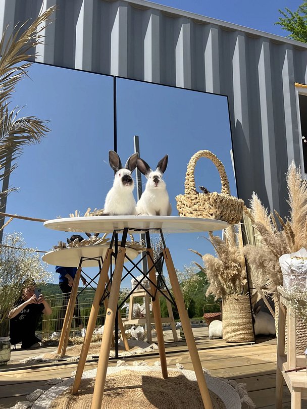 На территории расположено невероятно теплое, милое и пушистое пространство с белыми кроликами, их сейчас 65 особей (все животные привиты). Всех крольчат можно брать на руки и кормить морковкой (предоставляется глэмпингом), дети их особенно обожают.