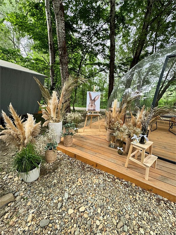 На территории к вашим услугам спа-зона с подогреваемым бассейном и баней с панорамным видом, которая доступна даже без проживания, бистро с вкусными завтраками, обедами и ужинами, общая зона отдыха у костра, детский игровой домик и даже прозрачный купол для проведения праздников и небольших конференций. Вы можете приехать всего на один день с 10:00 до 20:00 или остаться на ночь. Особенное очарование глэмпингу придают домашние ручные животные и 65 белоснежных кроликов. А также, здесь всегда будут рады видеть вас с вашими любимыми питомцами.