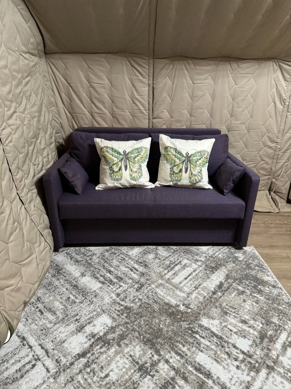В тенте также представлены: теплый пол, сплит-система, подогреваемая простынь, мини-холодильник, посуда, электрический чайник, фен, банные принадлежности, кровать 180 см, диван спальное место 160 см.