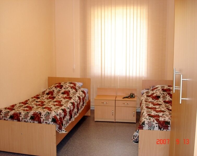 В номере: 2 кровати, 2 тумбочки, шкаф, холодильник, телевизор, умывальник, 2 полотенца. Душевая комната и туалет на этаже.
