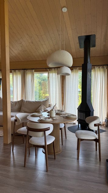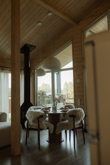 Внутренняя обстановка сочетает в себе современность и домашний уют. Две просторные спальни обеспечивают комфортные условия каждому гостю. Просторная кухня-гостиная оснащена всеми необходимыми приборами и посудой, позволяя приготовить блюда на любой вкус. Особое внимание привлекает панорамная ванна с видом на лес и стильный электрический камин, создающие атмосферу тепла и расслабления. Для отдыха предусмотрены проектор и акустическая система Marshall, обеспечивающие незабываемые впечатления от просмотра фильмов или прослушивания музыки.
