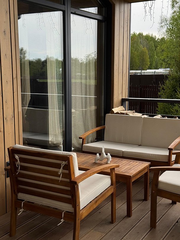 Просторная терраса служит идеальным местом для завтраков на свежем воздухе или тихих семейных ужинов. Здесь также предусмотрена зона для приготовления пищи на открытом огне и кострище с креслами, позволяющее провести волшебные вечера у огня под звездным небом. Автовладельцы оценят наличие парковки, а видеоконтроль у входа обеспечивает дополнительную безопасность гостям.