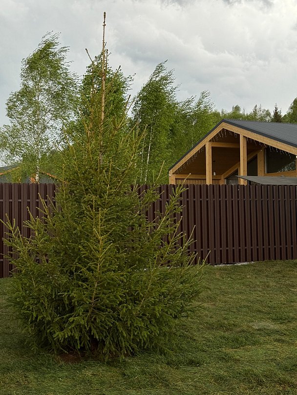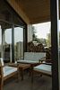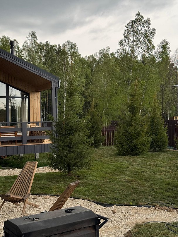 Дом в поселке Green Forest Premium окружен хвойным лесом. Просторные панорамные окна выходят на живописный пейзаж. Внутри дома есть все для комфортного проживания: две спальни, кухня-гостиная с камином и диваном, панорамная ванна с тропическим душем и видом на лес, электросауна.