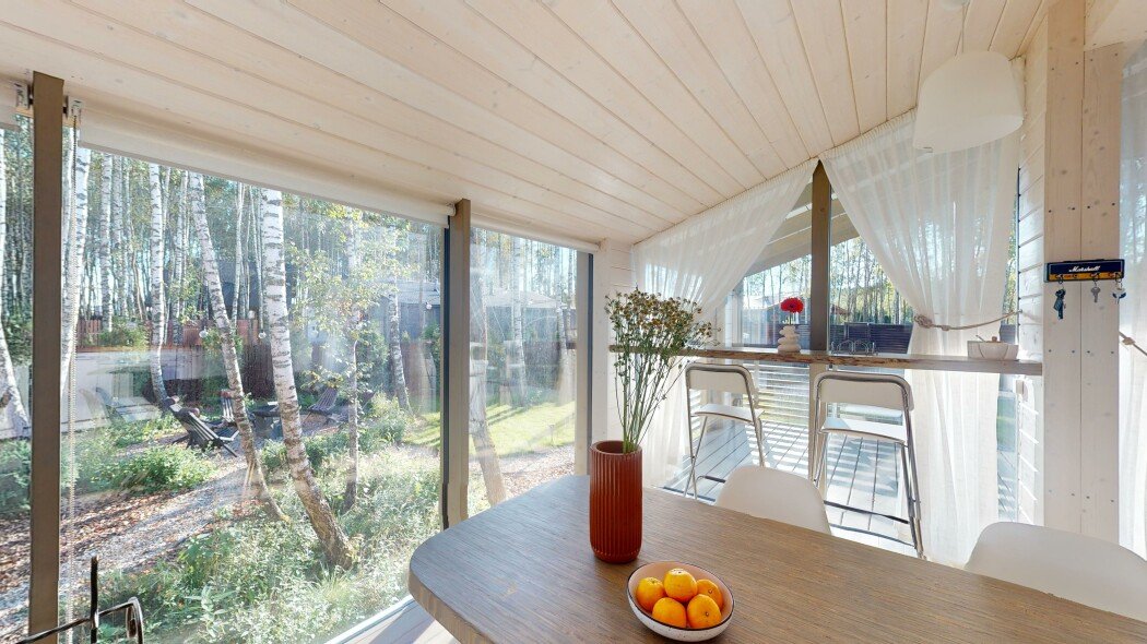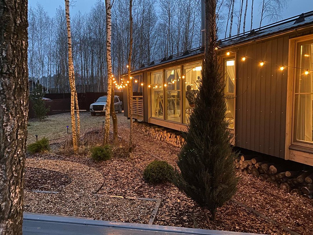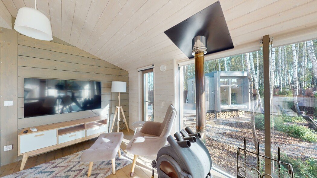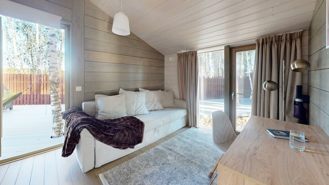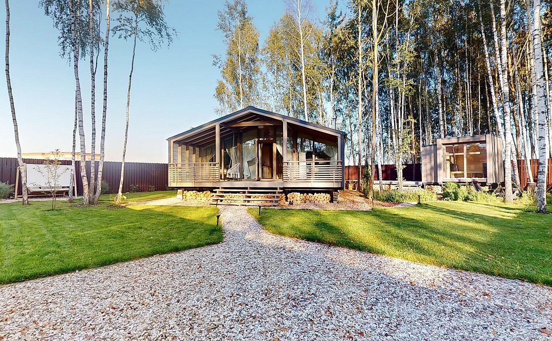 На территории есть уютные качели, а на террасе дома кресло-гамак, где вы сможете провести время за чтением своей любимой книги. Вечером расслабиться вам поможет панорамная сауна, а после вы сможете отдохнуть у костра с чашечкой ароматного чая или на комфортной террасе дома в романтичной обстановке.