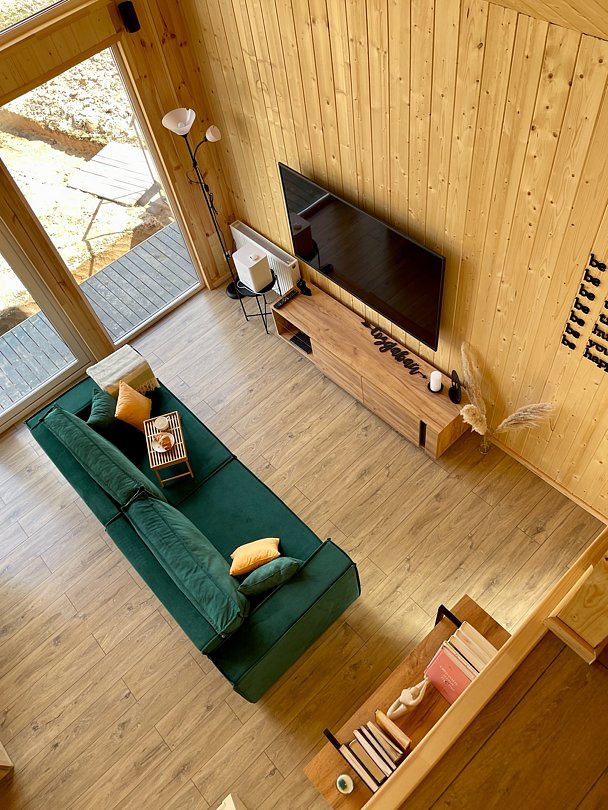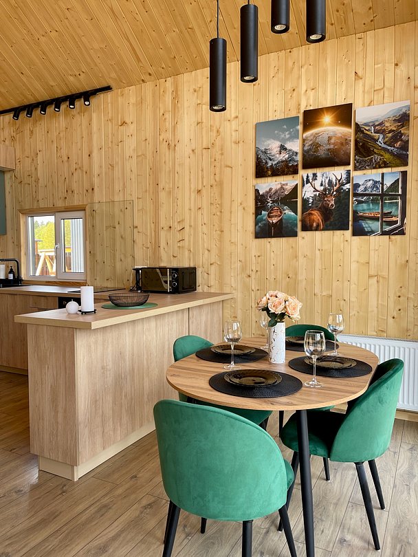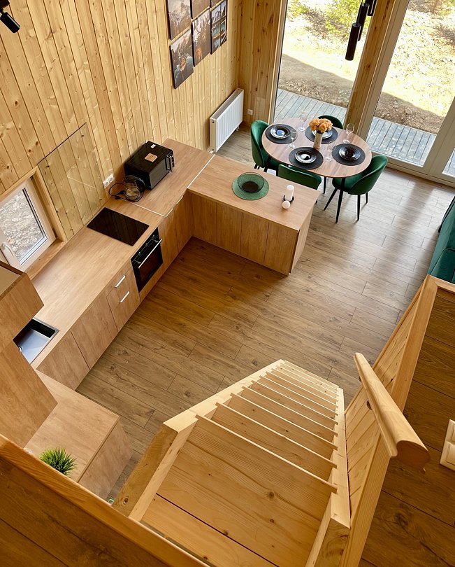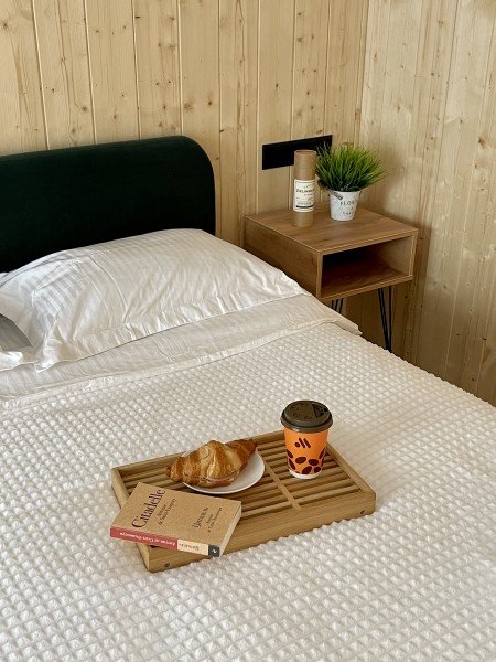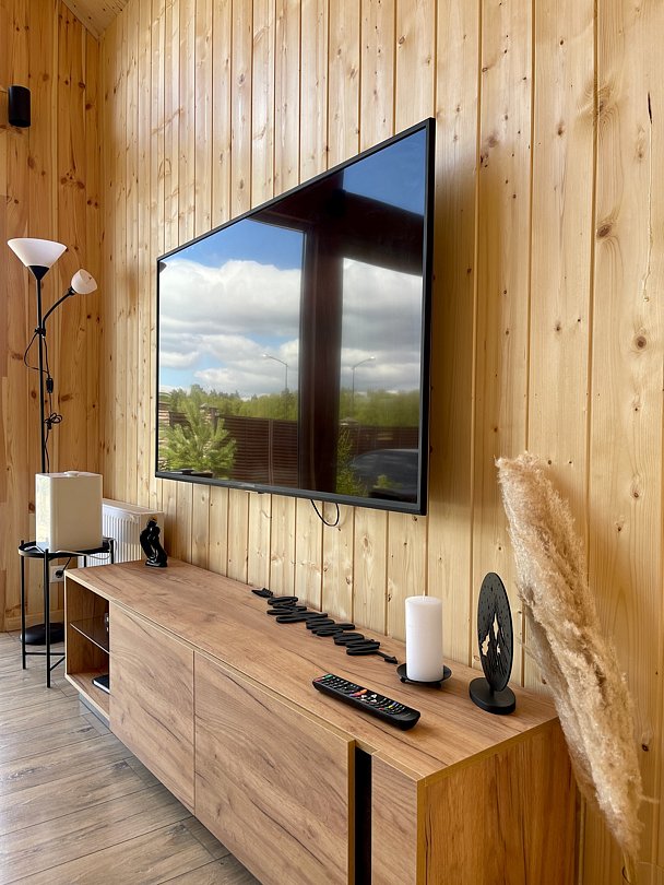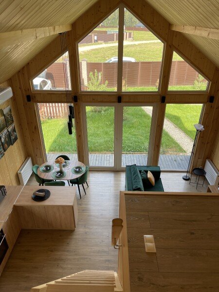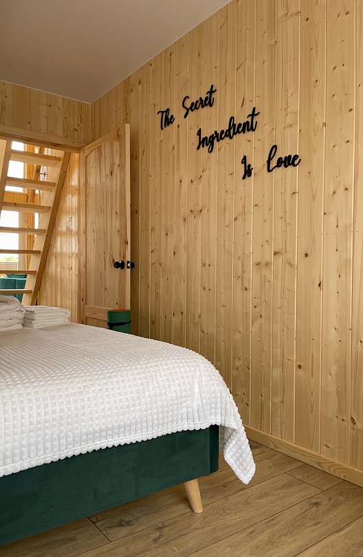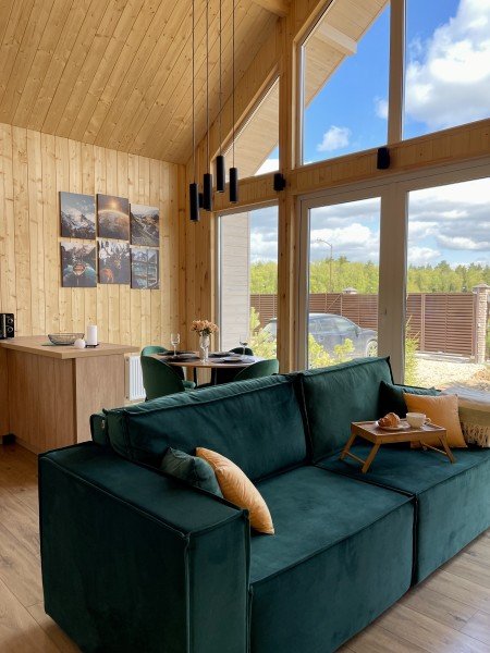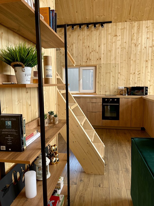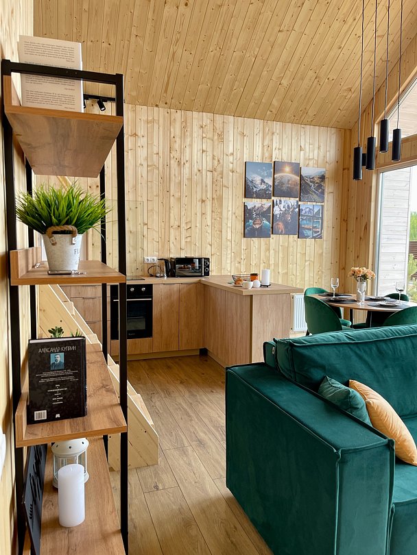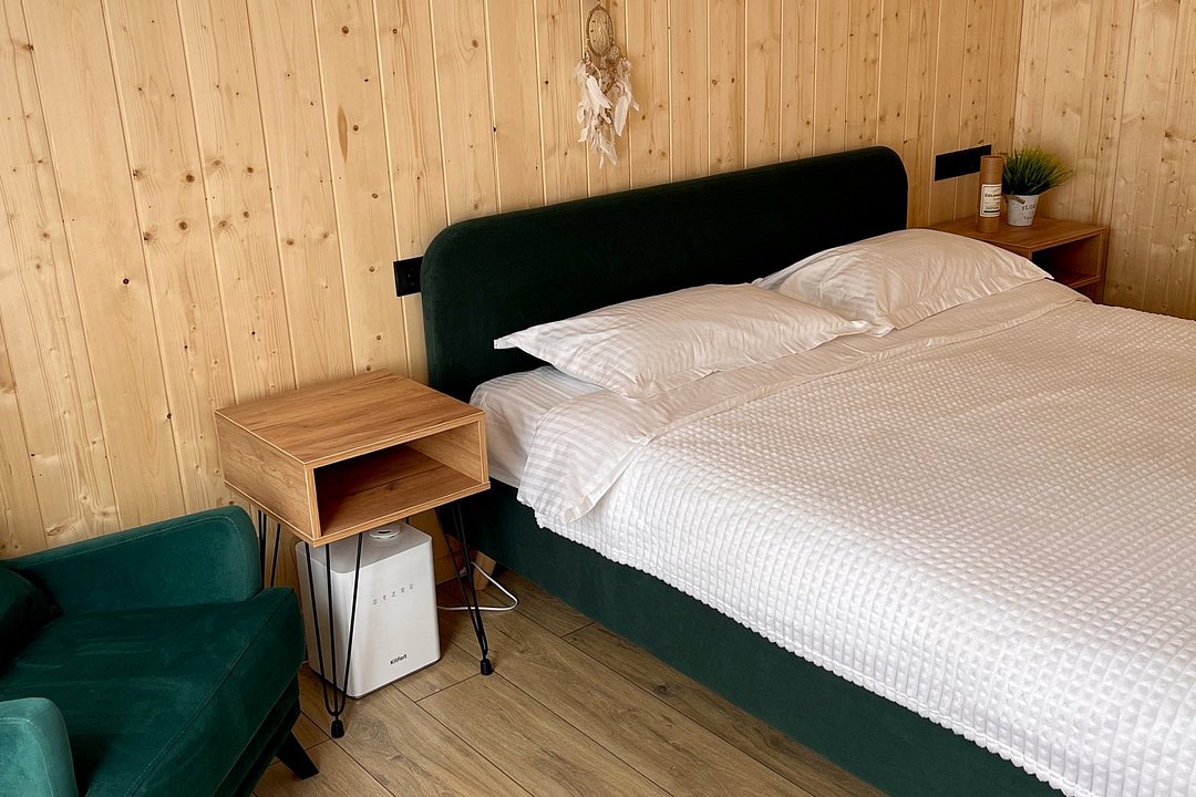 Внутри вас ждет благоустроенная спальня и просторная кухня-гостиная с раскладным диваном и большим телевизором, которые создадут атмосферу тепла и уюта. Каждая деталь интерьера продумана для вашего максимального комфорта: от постельного белья премиум-класса и мягких полотенец до тщательно оборудованной кухни, чтобы ваше пребывание стало поистине незабываемым.