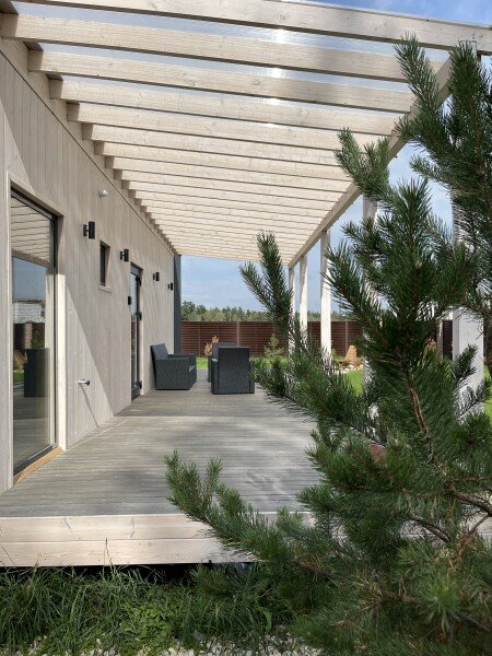 Обратите внимание, что в этом домике мини-холодильник, по предварительному запросу предоставляется сумка-холодильник. Площадь дома составляет 75 м², а веранда — 40 м².
