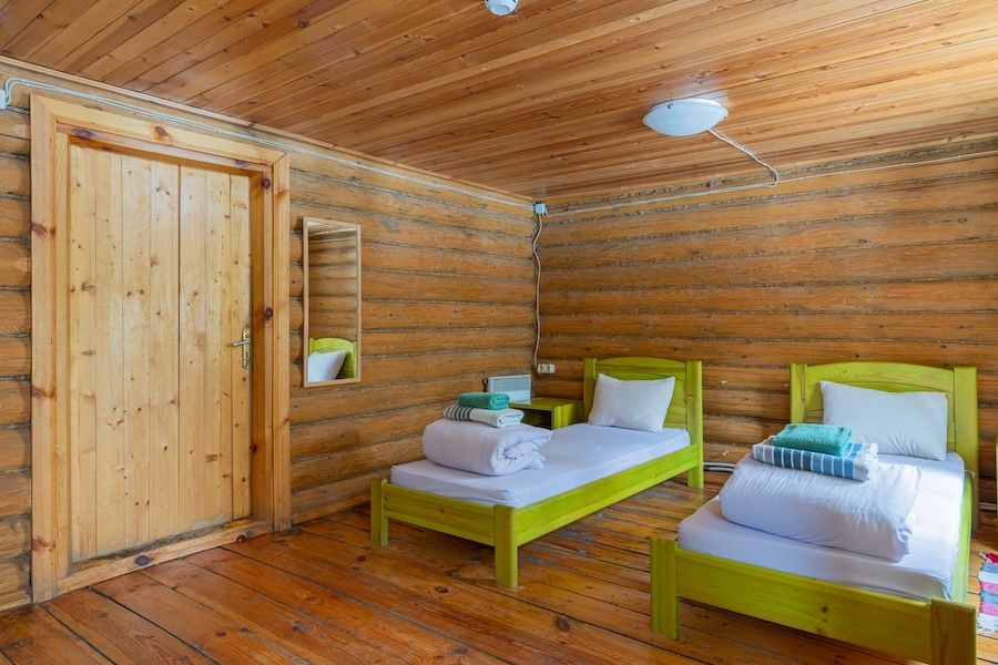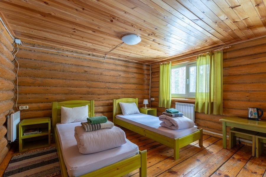- № 2: две одноместные кровати, одна прикроватная тумбочка, стол с двумя табуретками;