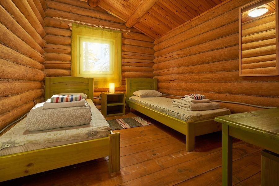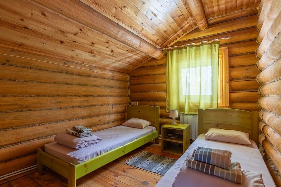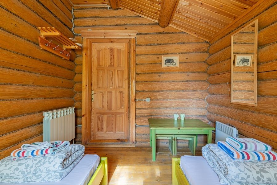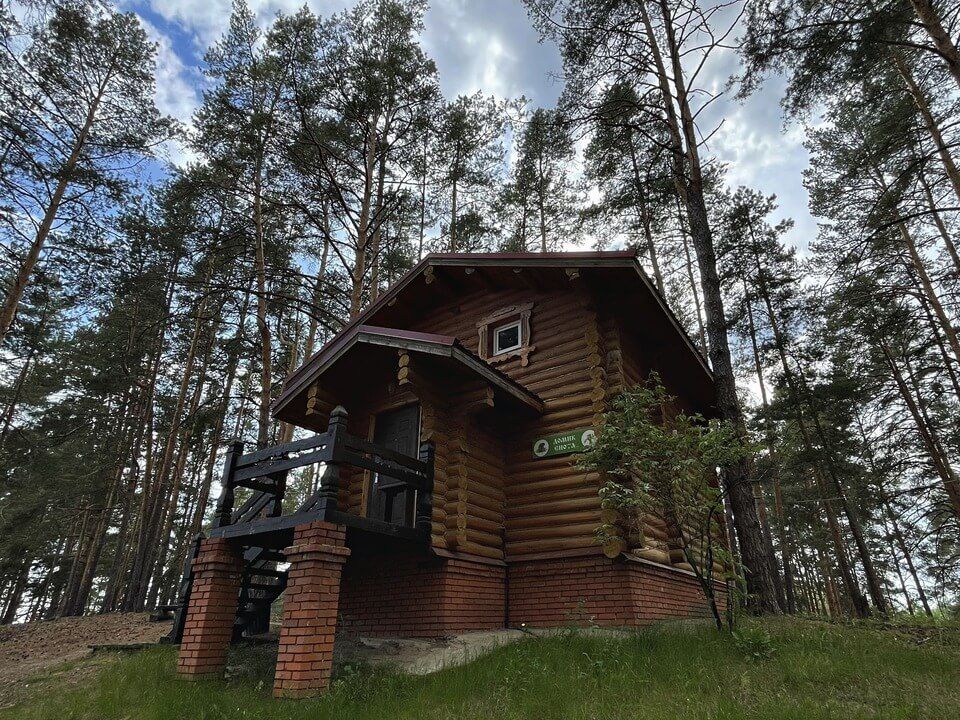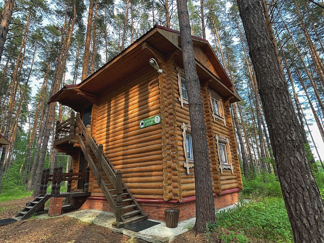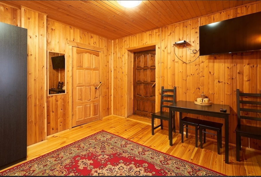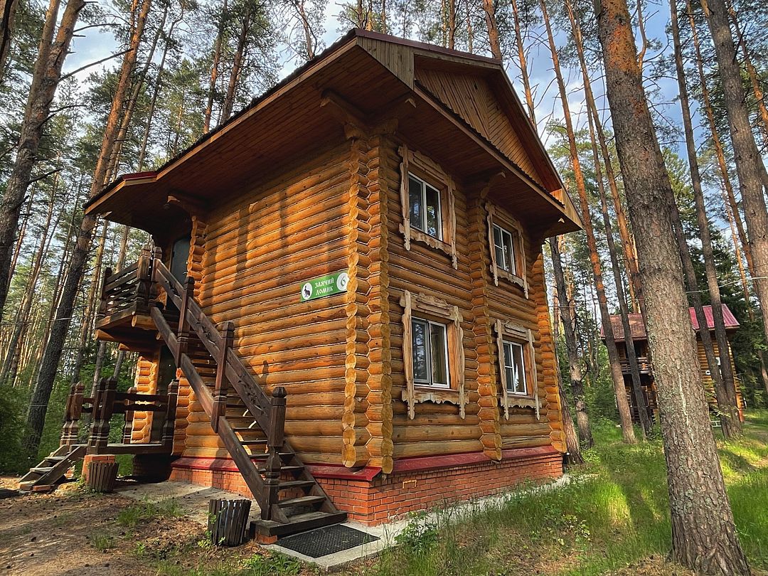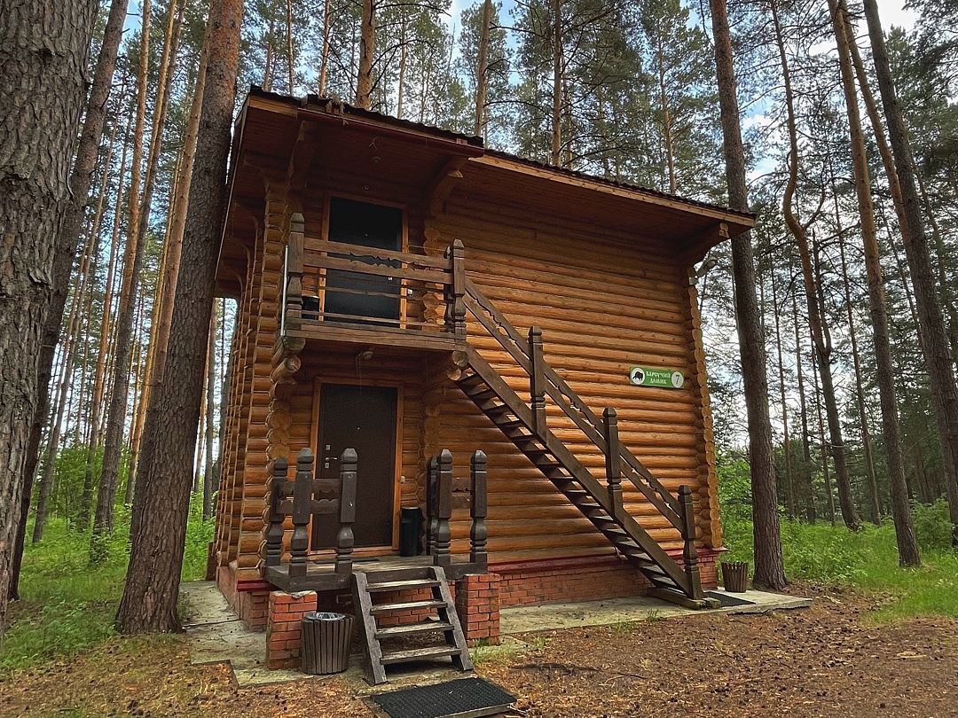 Бобровый домик – двухэтажный дом, с отдельными входами. На 2-ом этаже 2 номера, которые объединяет общий холл, один стол, две лавочки.