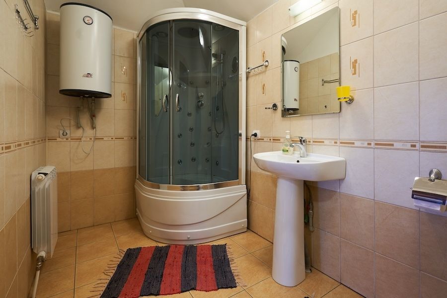 Двуспальная кровать, угловой диван раскладушка, стол с двумя табуретками, три прикроватные тумбочки, электрический чайник, микроволновка, холодильник, спутниковое ТВ, санузел и душевая раздельно.