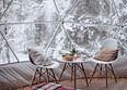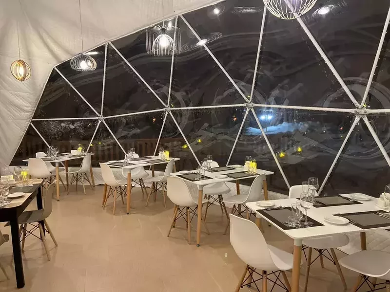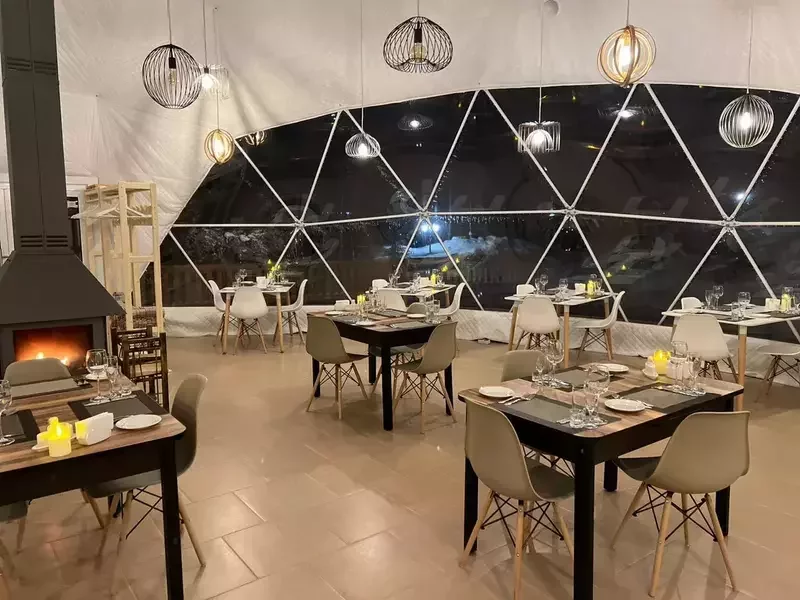 Шатёр снабжён панорамным окном, которое при необходимости можно завесить плотными шторами. Электрическое отопление (тёплый пол) и трёхслойное утепление стенок шатра позволяют поддерживать в нем комфортную температуру в любое время года. Рядом с шатром расположена терраса, где располагаются столик и кресла.