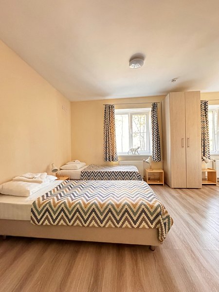 - первая спальня: две двуспальные кровати, одно односпальное кресло-кровать, комод для хранения вещей;