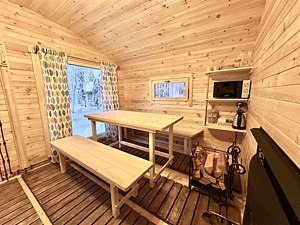 Домик построены из экологически чистого материала, хорошо отапливается, есть горячее водоснабжение. В домике есть ванная комната с душем и бесплатными туалетно-косметическими принадлежностями.
