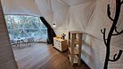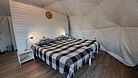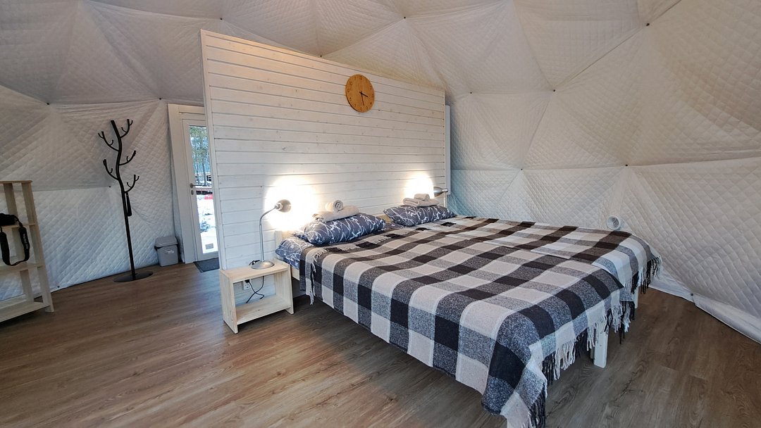 Электрическое отопление (тёплый пол), кондиционер и трёхслойное утепление стенок шатра позволяют поддерживать в нем комфортную температуру в любое время года. В эко-шатре есть ванная комната с душем и бесплатными туалетно-косметическими принадлежностями. Площадь 28 м2, рассчитан на комфортное размещение до 2 человек.