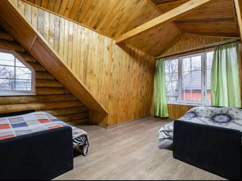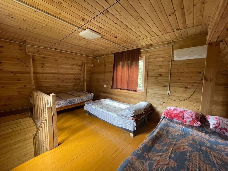 2 этаж: общая комната (три двуспальные кровати). Беседка, мангал.