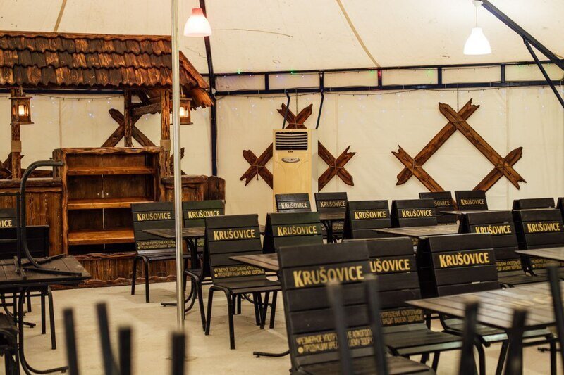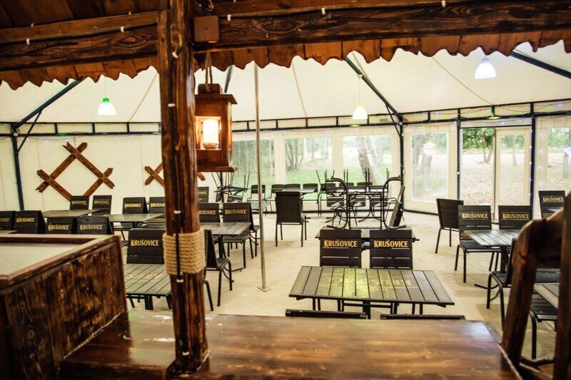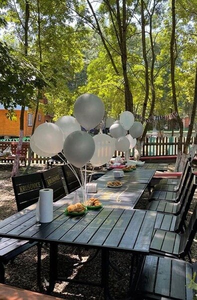 Предоставляется возможность арендовать столы на поляне, террасе или в банкетном зале. Рядом расположена мангальная зона, общий холодильник и парковка. Необходимо принести свои продукты.