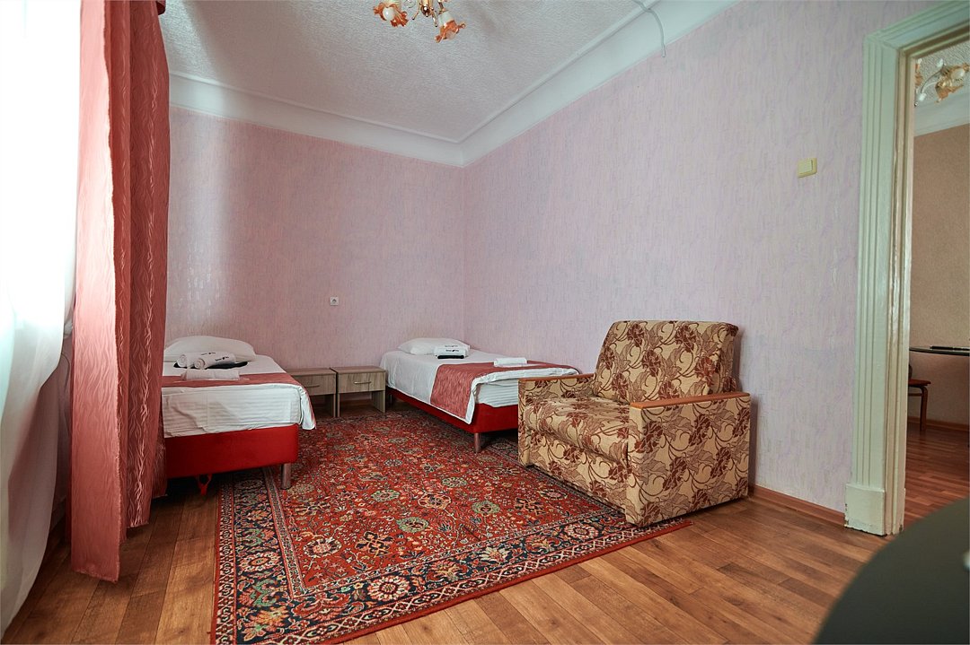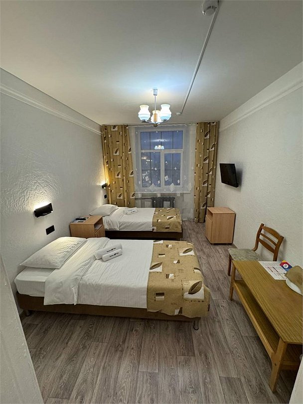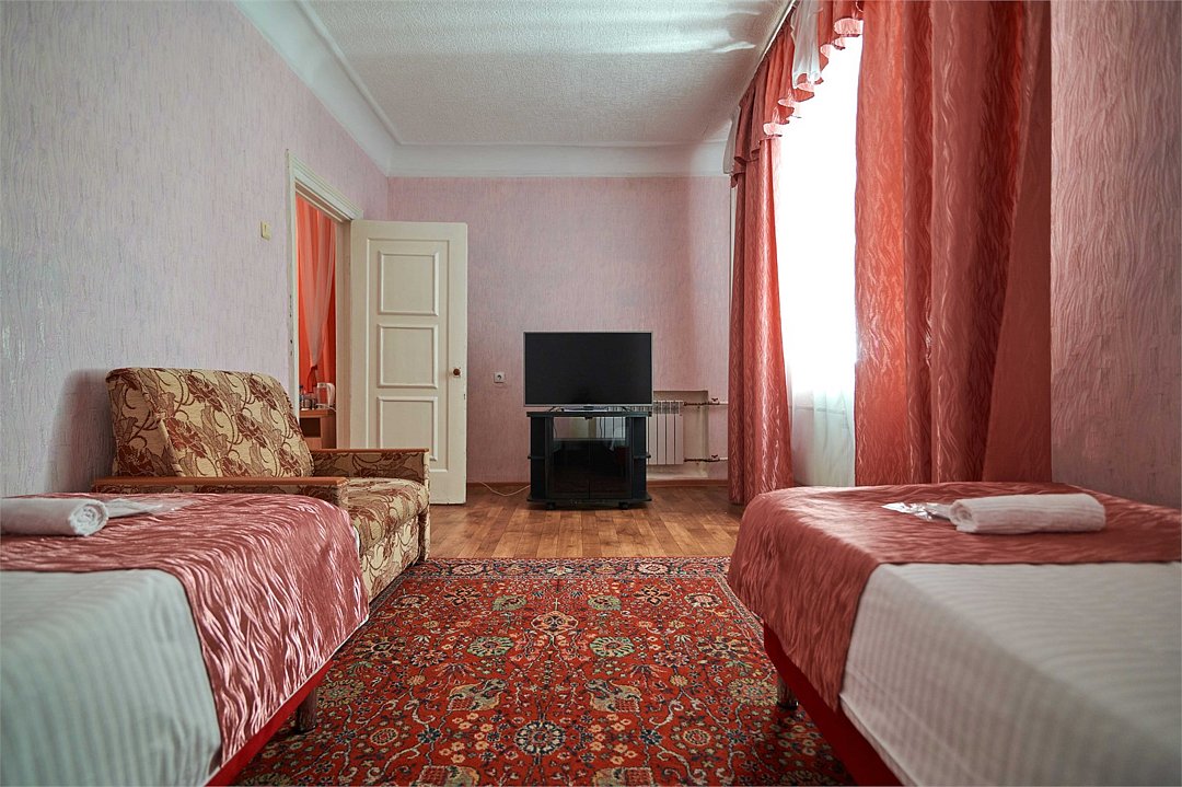 телевизор, Wi-Fi, светильник, душевая кабина, санузел, тапочки, тумбы, стулья, шкаф для одежды, вешалки, письменный стол, зеркало, две комнаты, чайный набор, обслуживание номеров, чайник, унитаз, раковина, питьевая вода, гостиная зона, душ, раздельный санузел, три односпальные кровати, вид во двор, ламинат, высокие потолки, стаканы, туалетные средства, туалет, мини-холодильник, номер для некурящих, можно с питомцамиВ гостиничном номере
