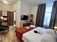 Просторный удобный двухкомнатный номер: гостиная и спальня, прихожая и раздельный санузел. В номере расположены две комфортные полутороспальные кровати, прикроватные тумбочки, шкаф, туалетный столик, диван, 2 кресла, журнальный столик, письменный стол, TV, многофункциональная звуковая панель, чайная станция, холодильник, бесплатный Wi-Fi. В ванной комнате предусмотрены: ванна, раковина, туалет, фен. В качестве комплимента вода без газа при заезде.Услуги и удобства