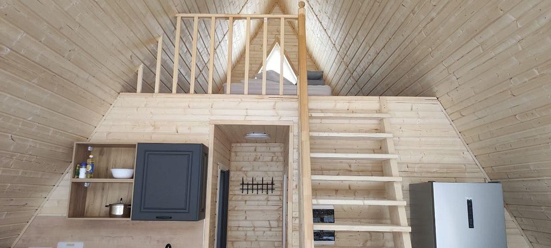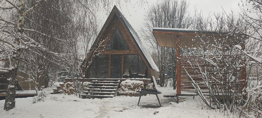 Стильный А-фрейм для комфортного отдыха со всеми удобствами городской квартиры. Планировка: гостиная и две спальни (в том числе на втором этаже), горячая и холодная вода, канализация в доме, душ, современная кухня, мангал.