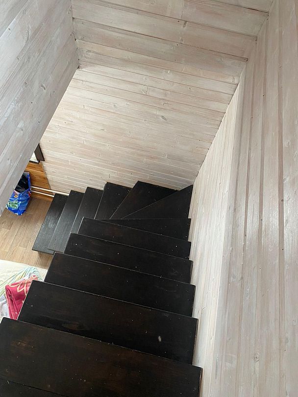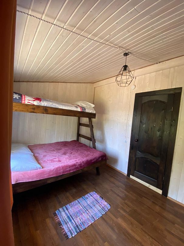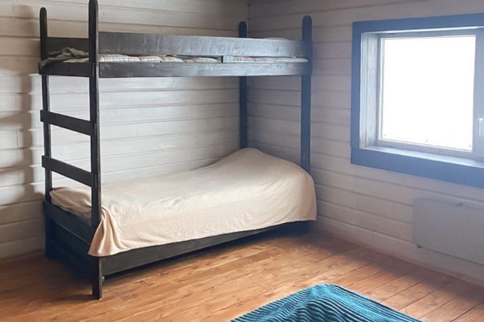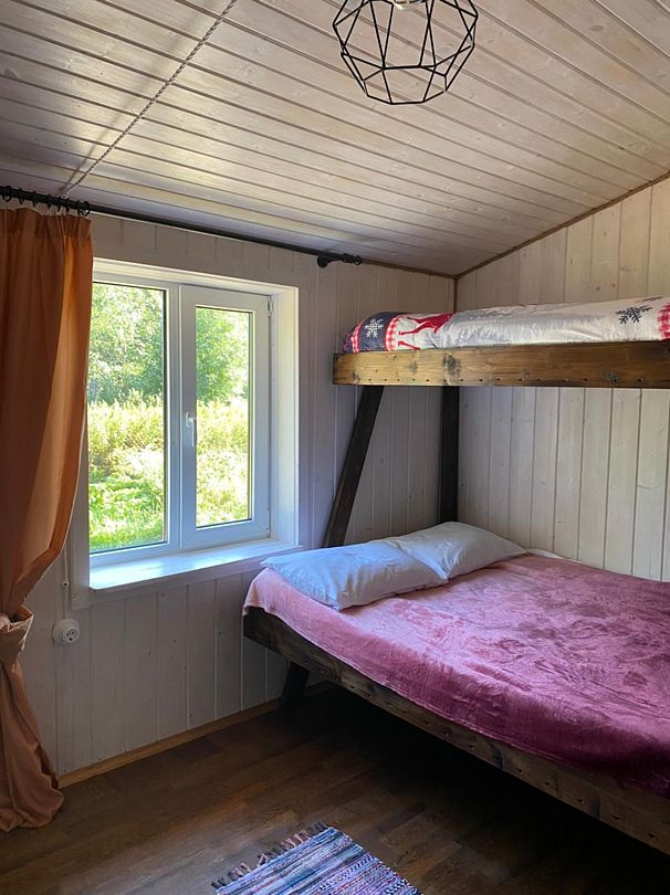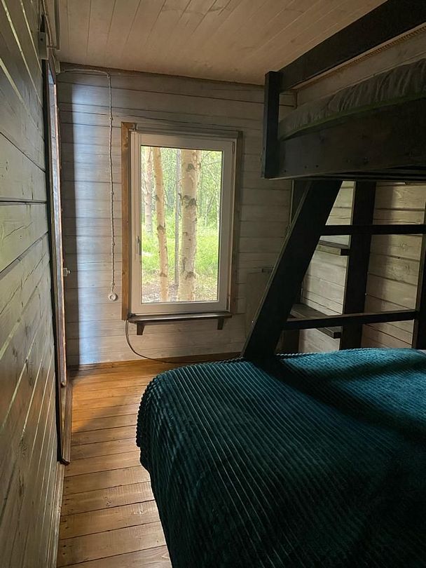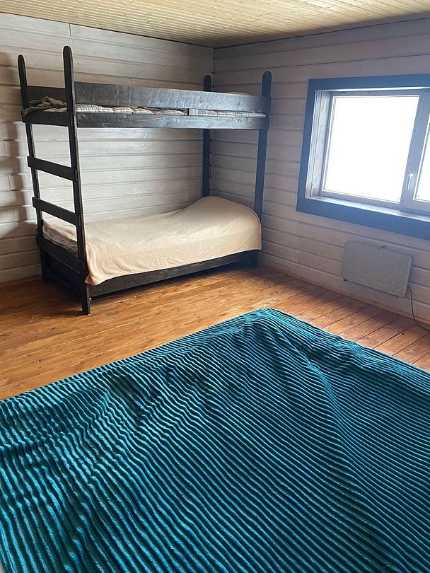Поднимаясь на второй этаж, вы попадаете в просторную комнату, где царит атмосфера уюта и расслабления. Здесь стоит большая двуспальная кровать, а рядом — двухъярусная кровать, идеально подходящая для семьи с детьми или гостей. Из окон открывается потрясающий вид на воду, который завораживает в любое время суток — будь то утренний туман, дневное солнце или вечерние оттенки заката.