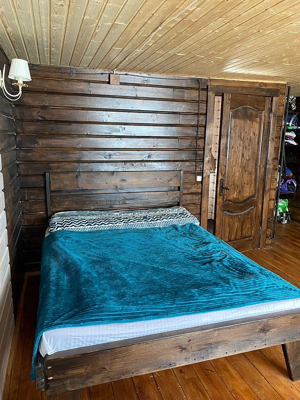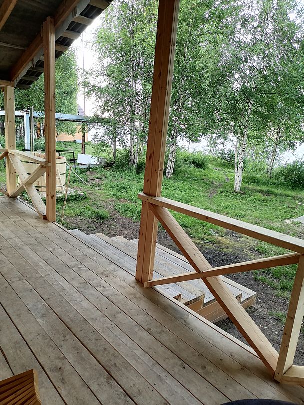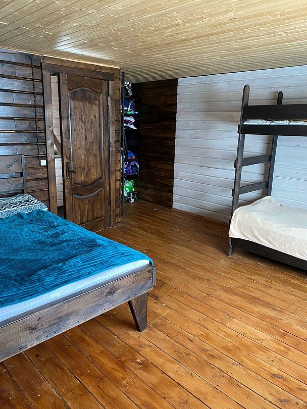 Дом подходит для большой компании, есть 3 спальные комнаты (кровати односпальные, но можно удобно сдвигать), небольшая кухня гостиная с драскладным диваном. На втором этаже большая кровать и двухьярусная. Огромная крытая веранда с видом на озеро, мангальная зона, а так же есть баня Фурако (горячая купель), есть аренда лодок.