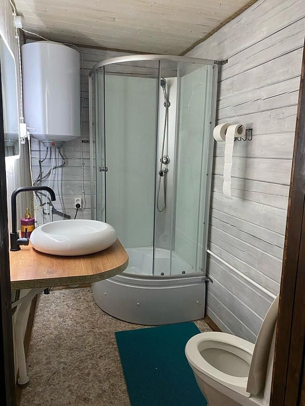 Ванная комната с душевой кабиной, раковиной, туалетом. Горячая и холодная вода.