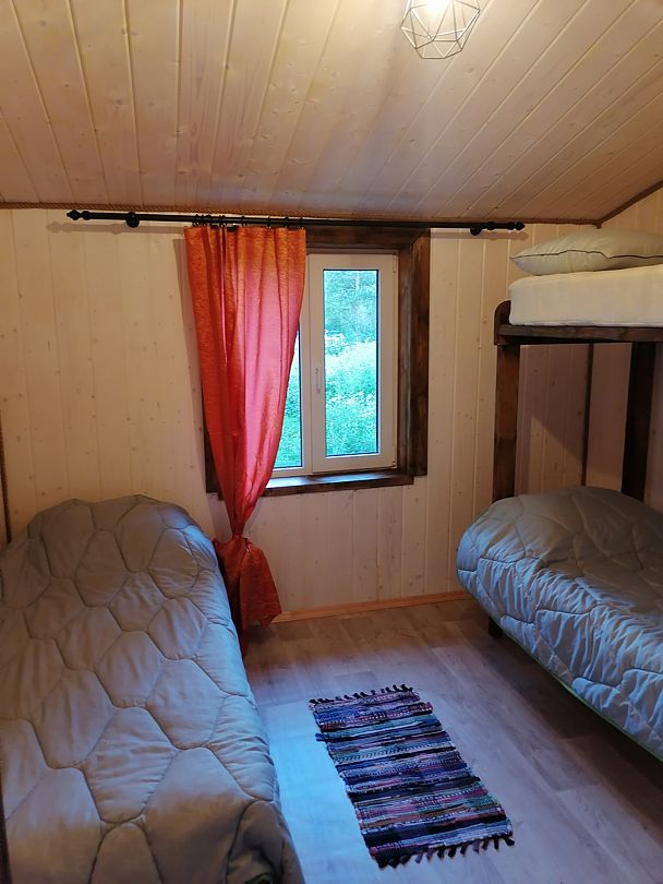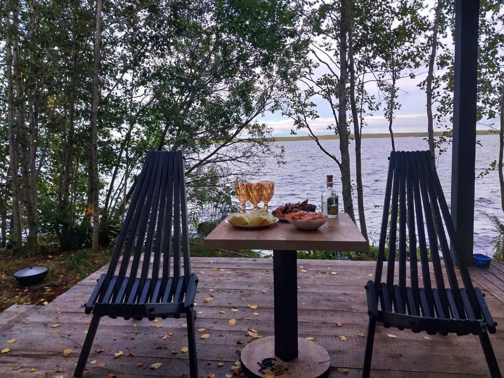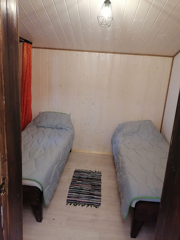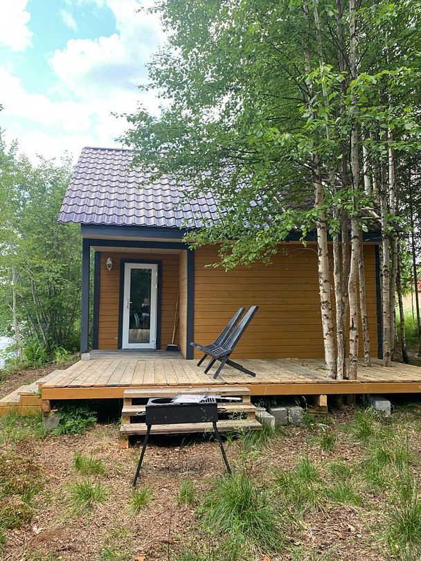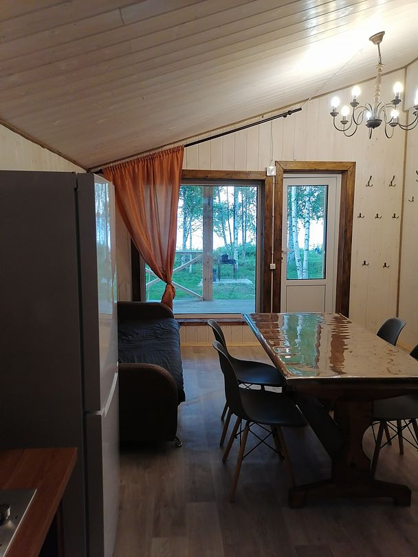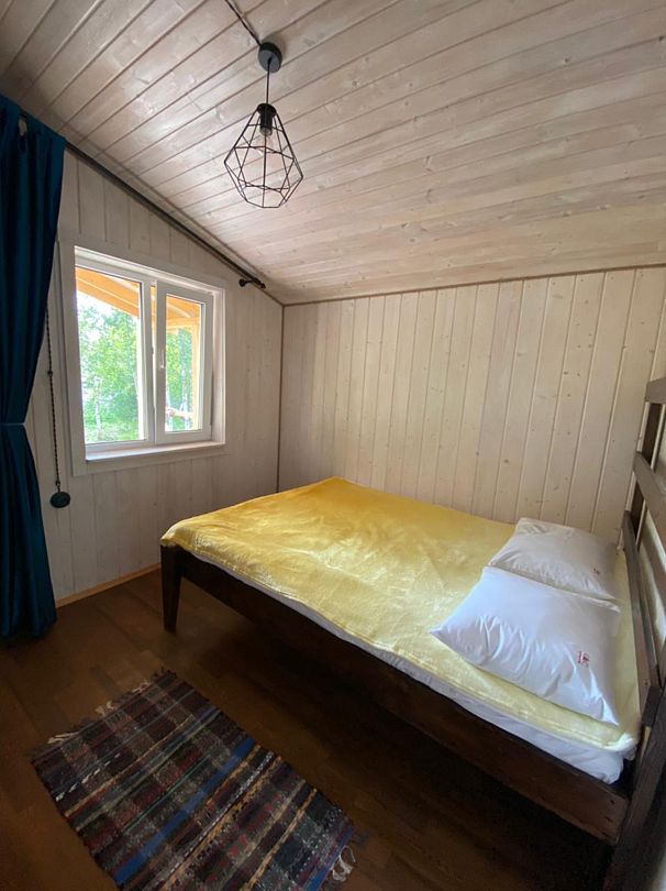 Полноценный одноэтажный комфортабельный дом, расположенный в 15 метрах от воды. С двумя спальнями. В одной двух-местная кровать с видом на озеро. В другой спальне двухьярусная кровать и односпальная вид на улицу. На первом этаже кухня-гостиная с панорамным окном, столом со стульями и раскладным диваном. Также,есть душевая с туалетом, горячая и холодная вода. Большая терраса с видом на озеро оборудована уличной мебелью.
