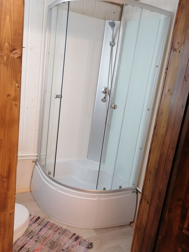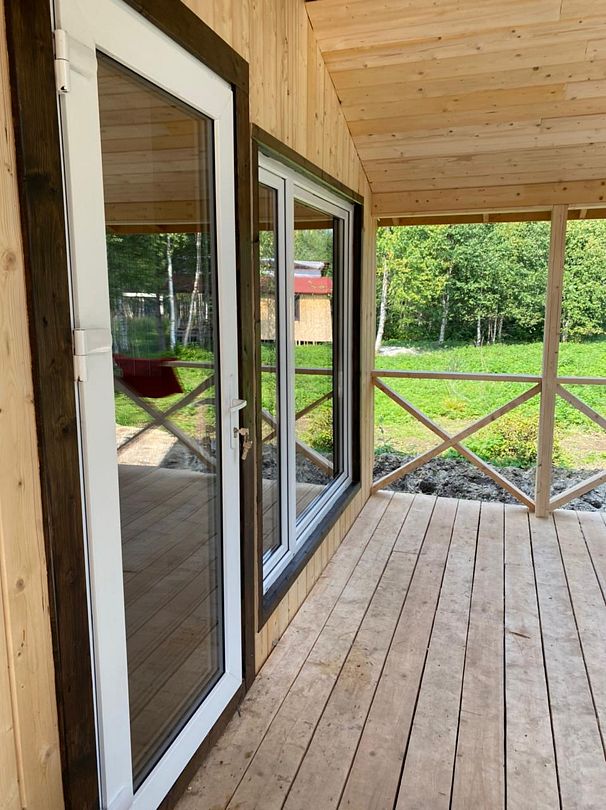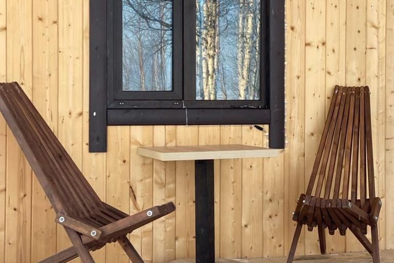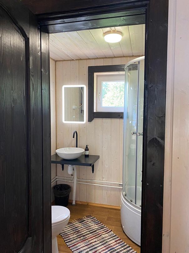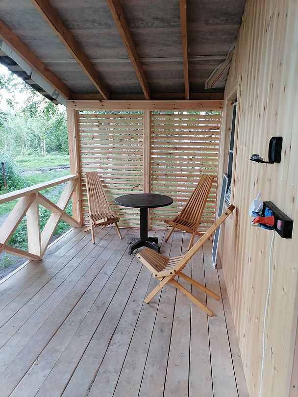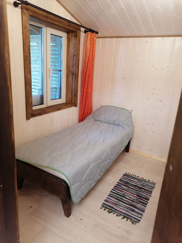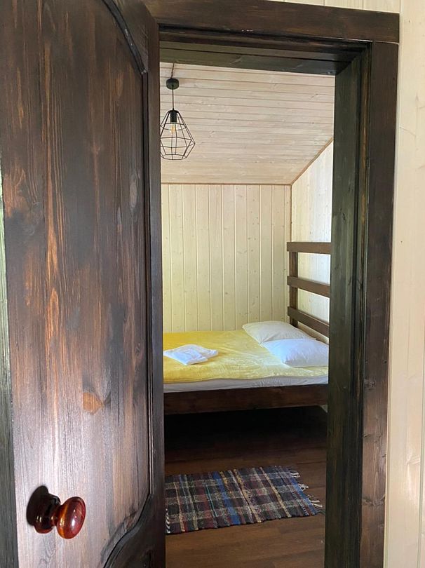 Полноценный одноэтажный комфортабельный дом, расположенный в 15 метрах от воды. С двумя спальнями. В одной двух-местная кровать с видом на озеро. В другой спальне двухьярусная кровать и односпальная вид на улицу. На первом этаже кухня-гостиная с панорамным окном, столом со стульями и раскладным диваном. Также,есть душевая с туалетом, горячая и холодная вода. Большая терраса с видом на озеро оборудована уличной мебелью.
