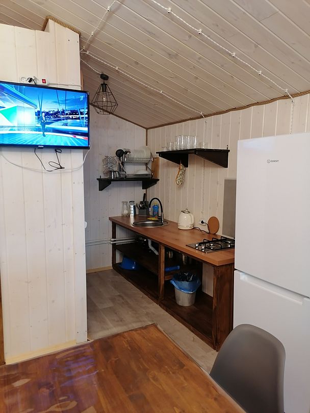 Кухня-гостиная с диваном. Кухня оборудована раковиной, газовой поверхностью, холодильником, электрочайником. Вся необходимая посуда. Стол и стулья.