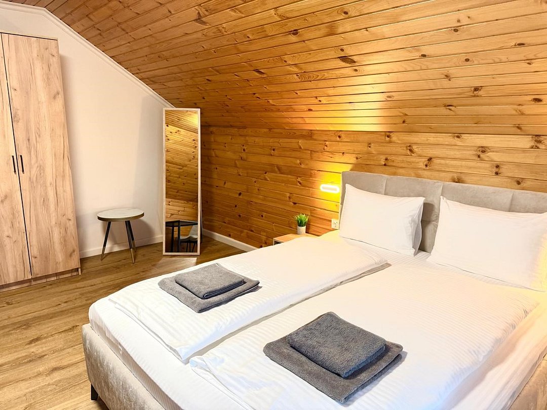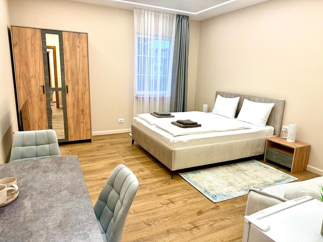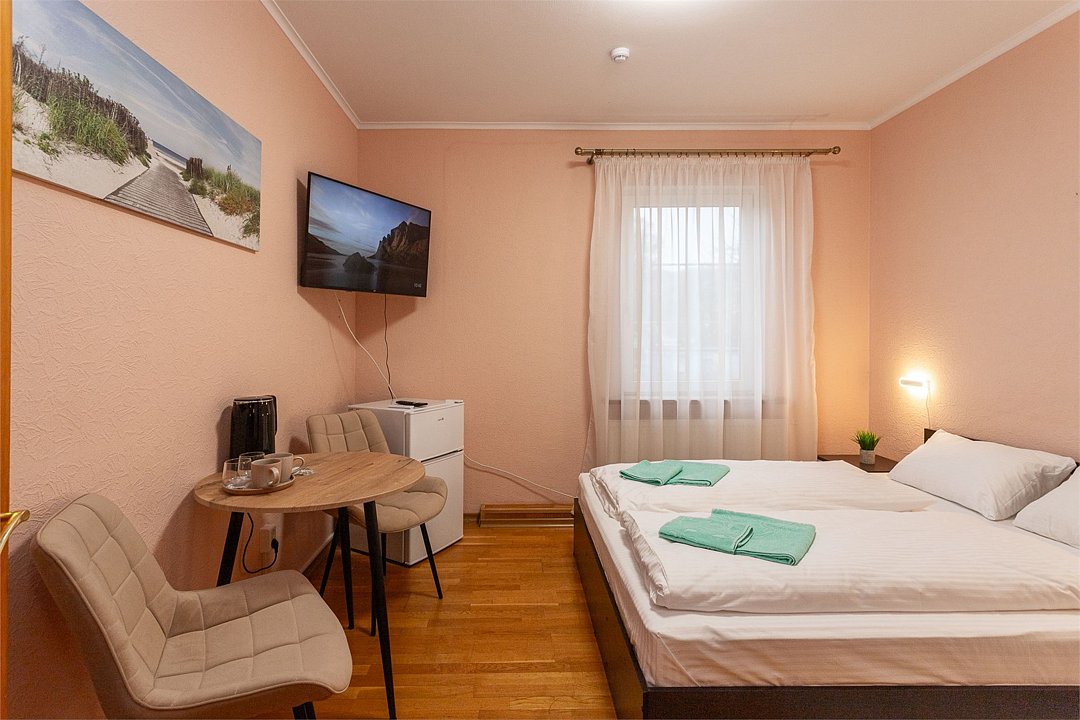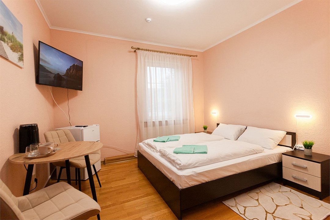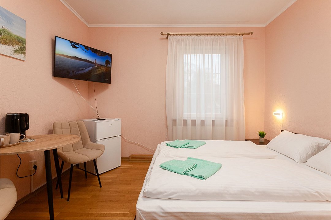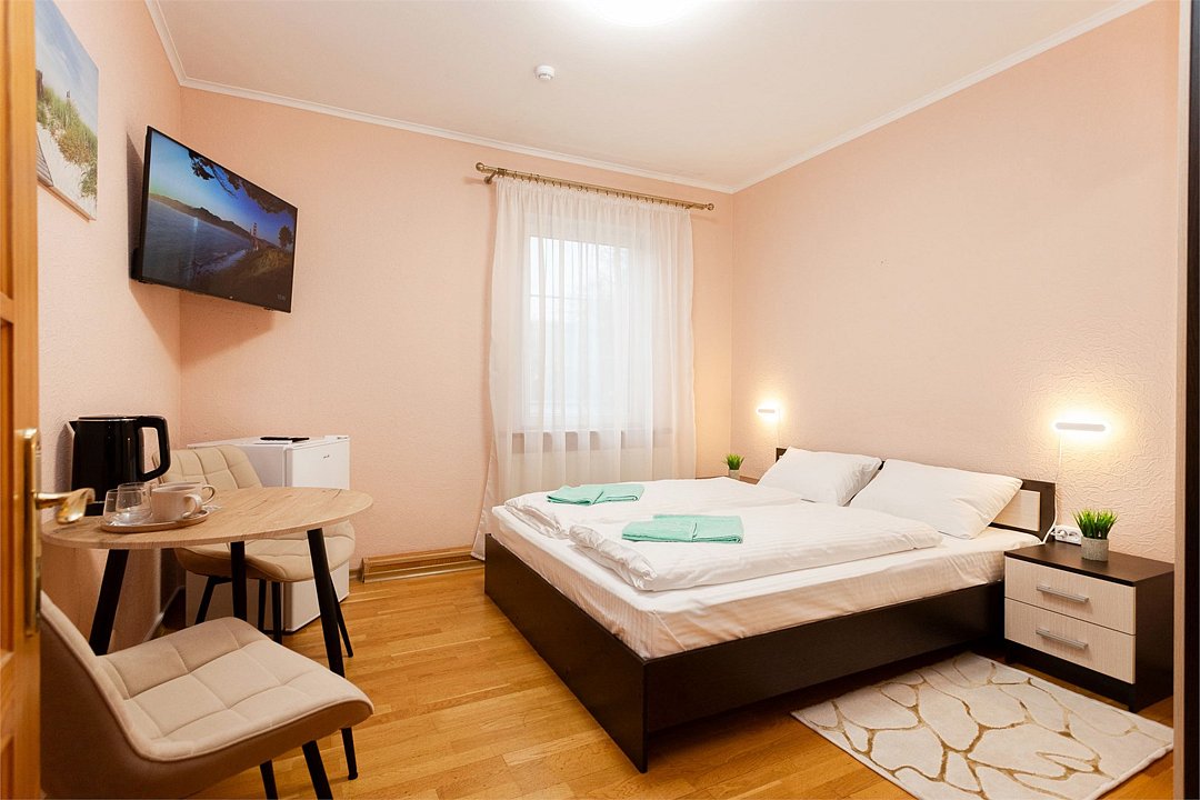 Однокомнатный номер оснащен всем необходимым для комфортного размещения гостей: удобной двуспальной кроватью 200*160 с ортопедическим матрасом, функциональной мебелью для хранения личных вещей и багажа, включая просторный шкаф и прикроватные тумбочки. В номере также предусмотрена ванная комната с душевой кабиной, феном и набором туалетных принадлежностей. Гости могут воспользоваться бесплатным Wi-Fi, телевизором. Для удобства имеется мини-холодильник и электрический чайник с набором для приготовления чая и кофе. Предусмотрена уборка номера и смена полотенец. По запросу предоставляются дополнительные услуги, такие как гладильные услуги, питание: завтра, обед и ужин. Номер идеально подходит для индивидуальных путешественников или пар, желающих насладиться комфортным и беззаботным отдыхом.Услуги и удобства