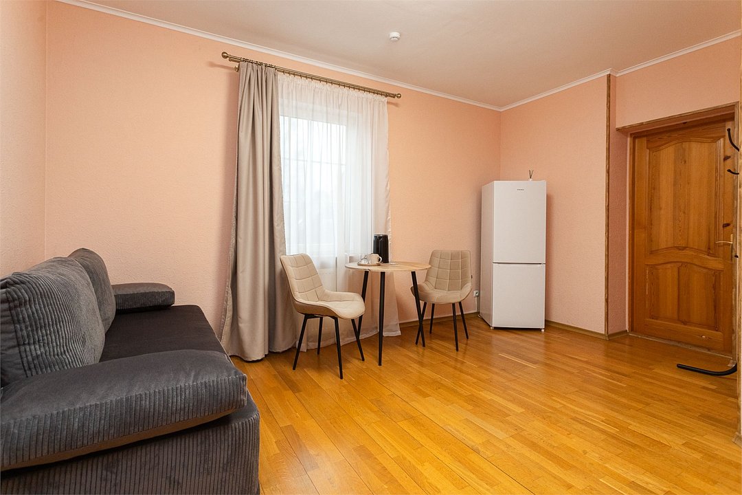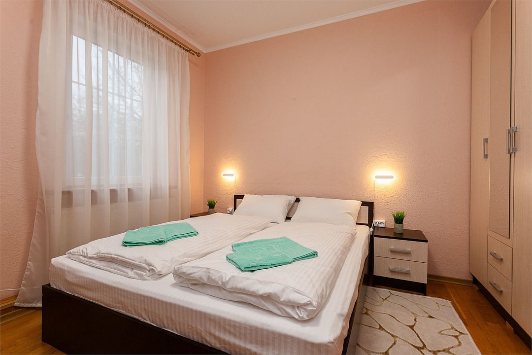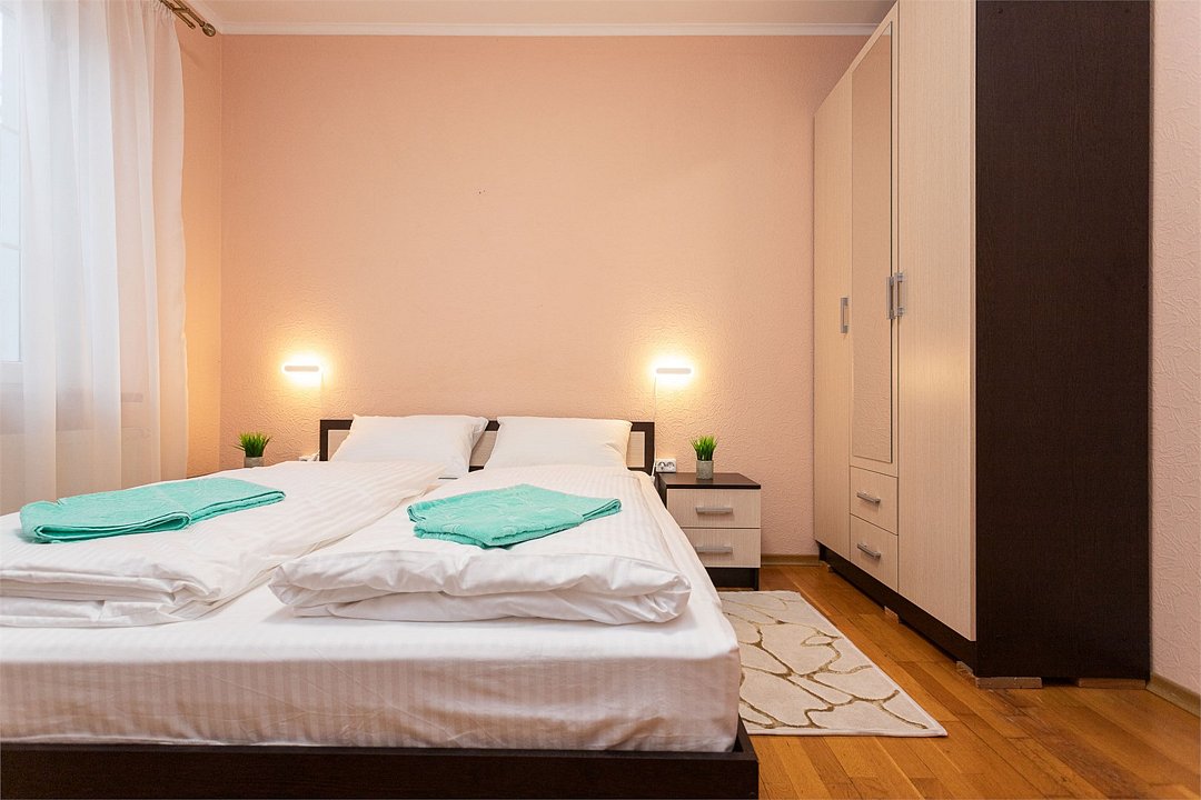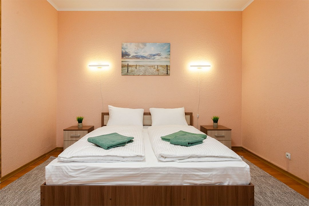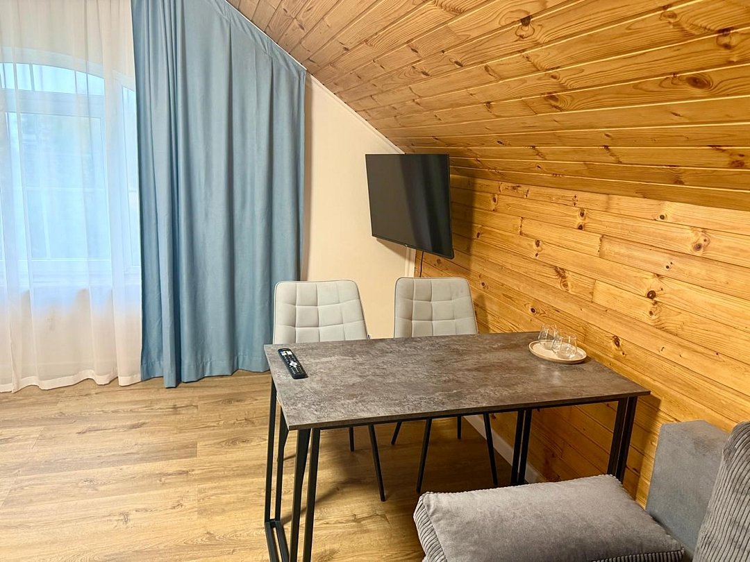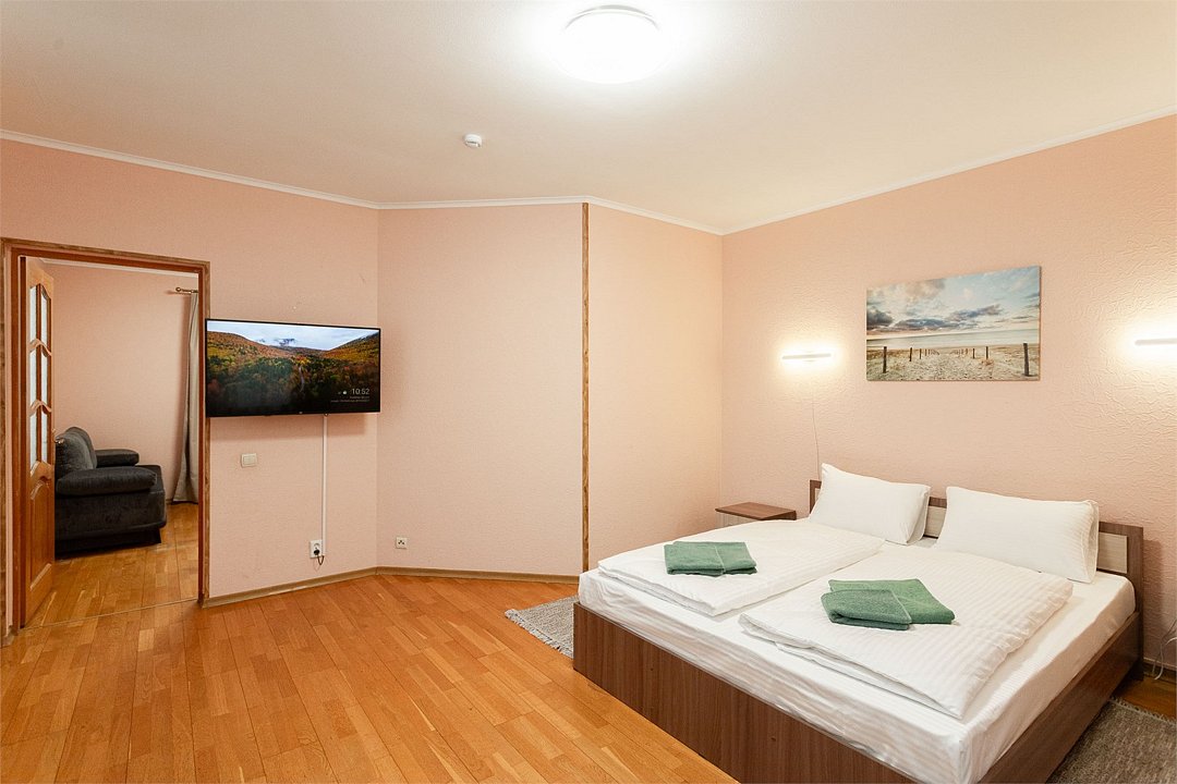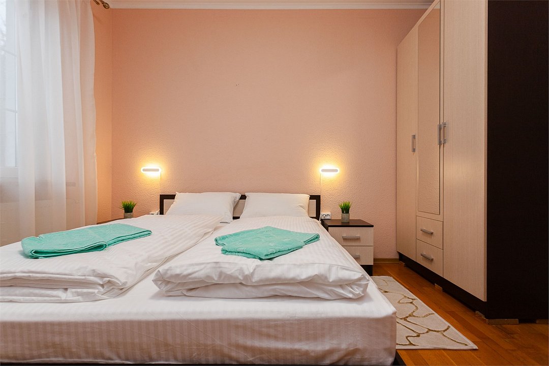 Двухкомнатный номер оснащен всем необходимым для комфортного размещения гостей. Две просторные комнаты оснащены двуспальной кроватью 200*160 с ортопедическим матрасом, раскладным диваном и предназначены для размещения 4-х гостей с возможностью дополнительного предоставления комфортных раскладных кроватей в количестве до 4-х штук за доп. плату. В номере также предусмотрена ванная комната с душевой кабиной, феном и набором туалетных принадлежностей. Гости могут воспользоваться бесплатным Wi-Fi, телевизором. Для удобства имеется мини-холодильник и электрический чайник с набором для приготовления чая и кофе. Предусмотрена уборка номера и смена полотенец. По запросу предоставляются дополнительные услуги, такие как гладильные услуги, питание: завтра, обед и ужин. Номер идеально подходит для путешествий с семьей.Услуги и удобства