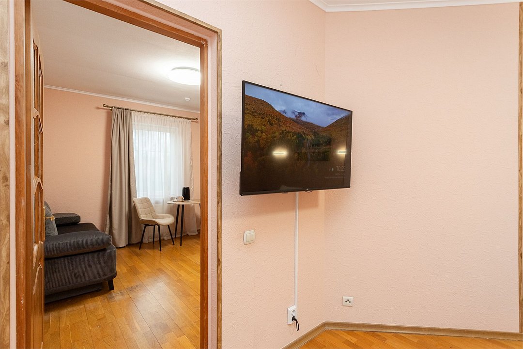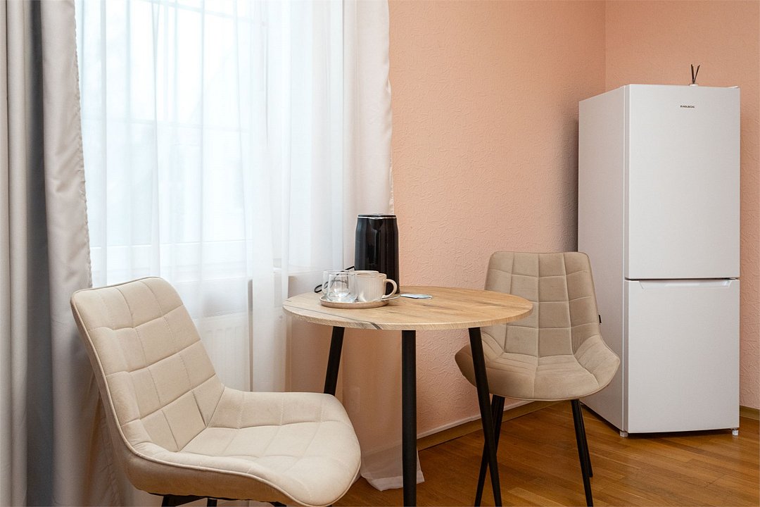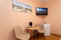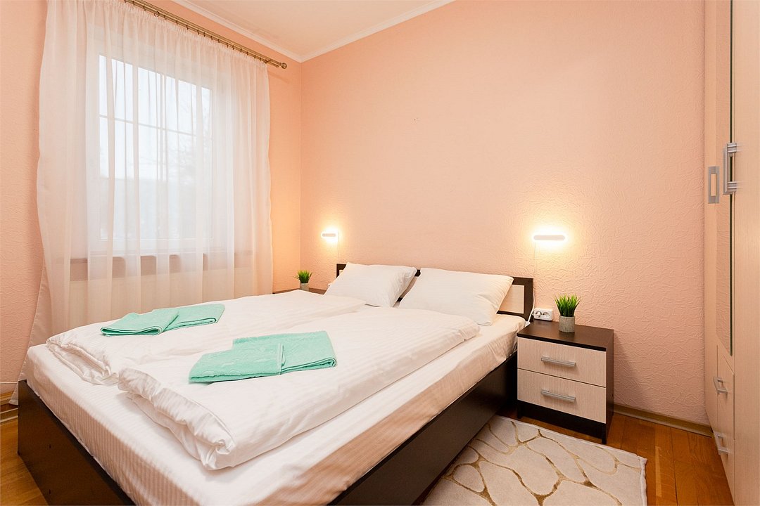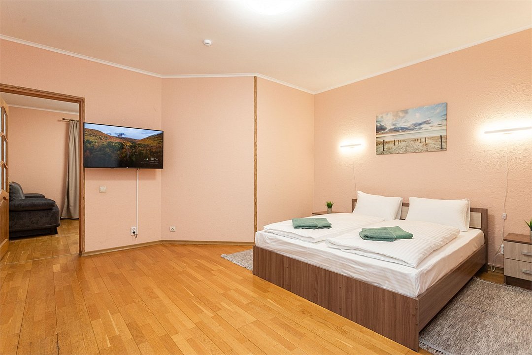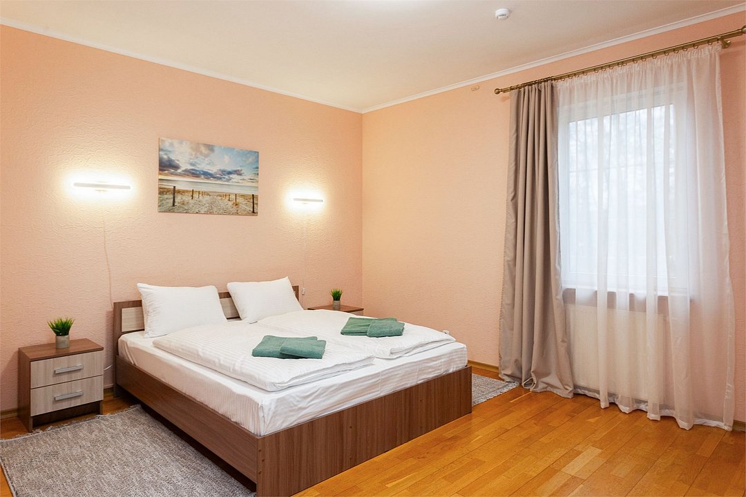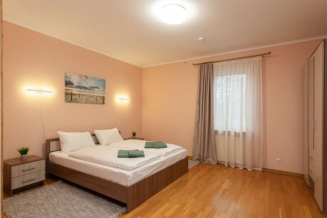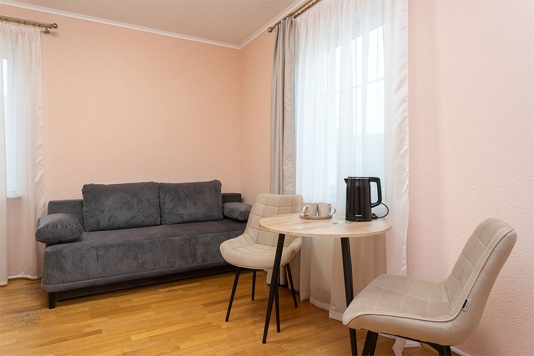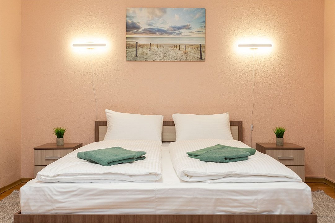 Двухкомнатный номер оснащен всем необходимым для комфортного размещения гостей. Две просторные комнаты оснащены двуспальной кроватью 200*160 с ортопедическим матрасом, раскладным диваном и предназначены для размещения 4-х гостей с возможностью дополнительного предоставления комфортных раскладных кроватей в количестве до 4-х штук за доп. плату. В номере также предусмотрена ванная комната с душевой кабиной, феном и набором туалетных принадлежностей. Гости могут воспользоваться бесплатным Wi-Fi, телевизором. Для удобства имеется мини-холодильник и электрический чайник с набором для приготовления чая и кофе. Предусмотрена уборка номера и смена полотенец. По запросу предоставляются дополнительные услуги, такие как гладильные услуги, питание: завтра, обед и ужин. Номер идеально подходит для путешествий с семьей.Услуги и удобства