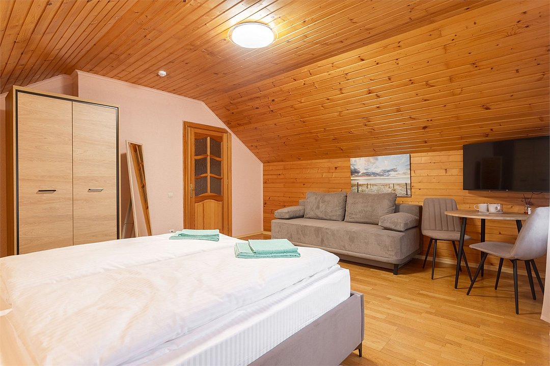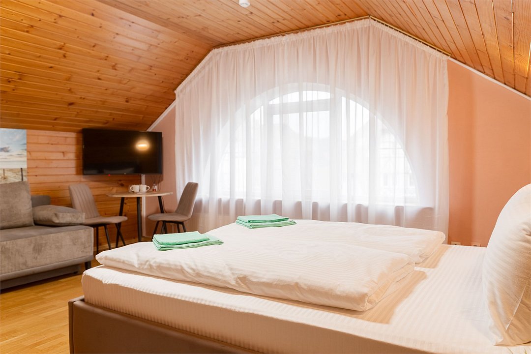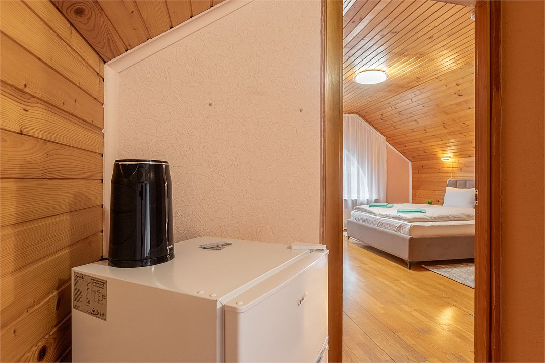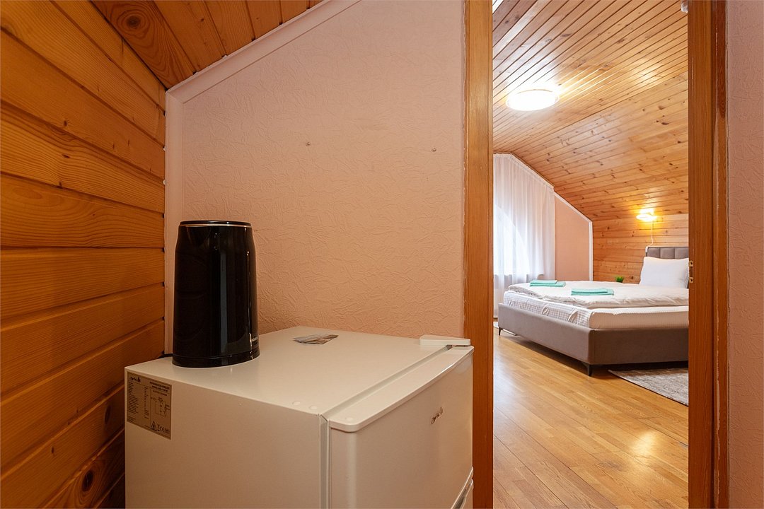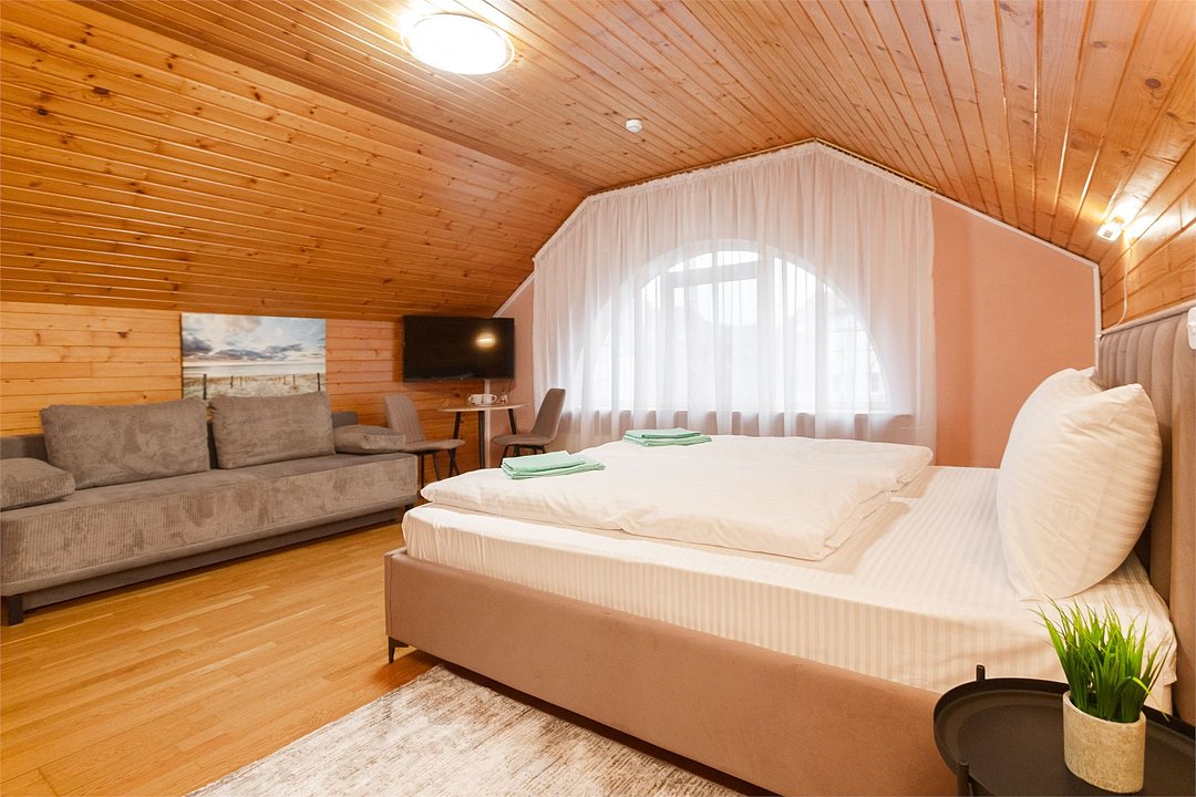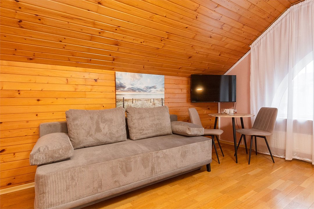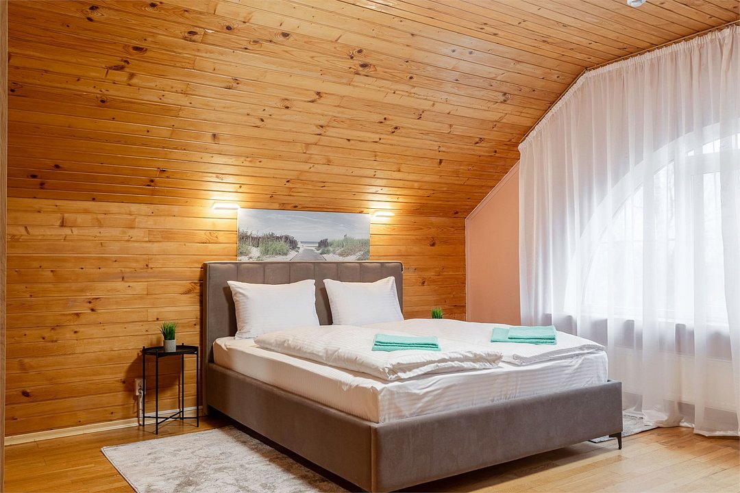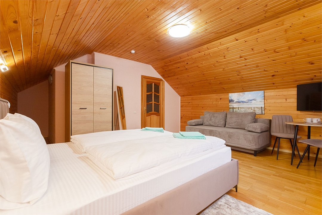 Просторный номер с естественным светом благодаря большим мансардным окнам, предлагает уютную обстановку для незабываемого отдыха в национальном парке «Куршская коса». Мансарда оснащена двуспальной кроватью 200*160 с ортопедическим матрасом, раскладным диваном и предназначены для размещения 4-х гостей с возможностью дополнительного предоставления комфортной раскладной кровати в количестве 1 шт. за доп. плату. В номере также предусмотрена ванная комната с душевой кабиной, феном и набором туалетных принадлежностей. Гости могут воспользоваться бесплатным Wi-Fi, телевизором. Для удобства имеется мини-холодильник и электрический чайник с набором для приготовления чая и кофе. Предусмотрена уборка номера и смена полотенец. По запросу предоставляются дополнительные услуги, такие как гладильные услуги, питание: завтра, обед и ужин. Номер идеально подходит для путешествий с семьей.Услуги и удобства
