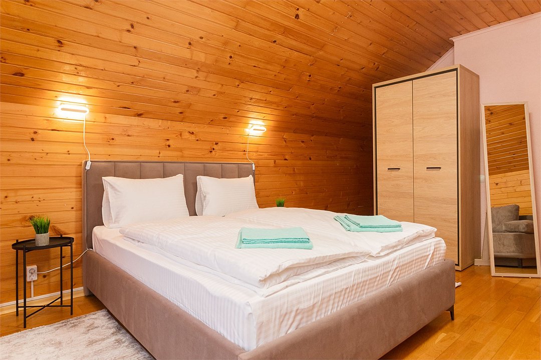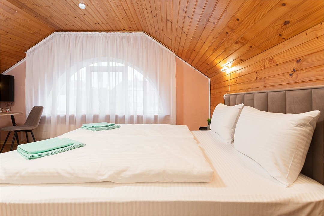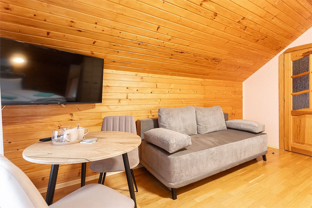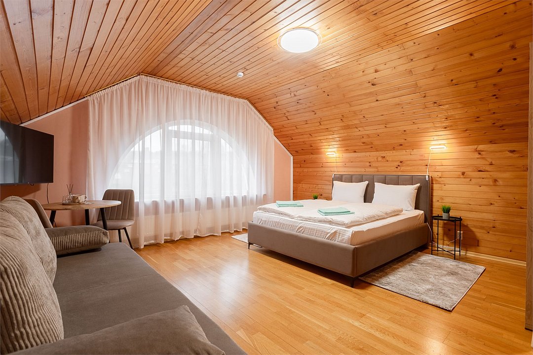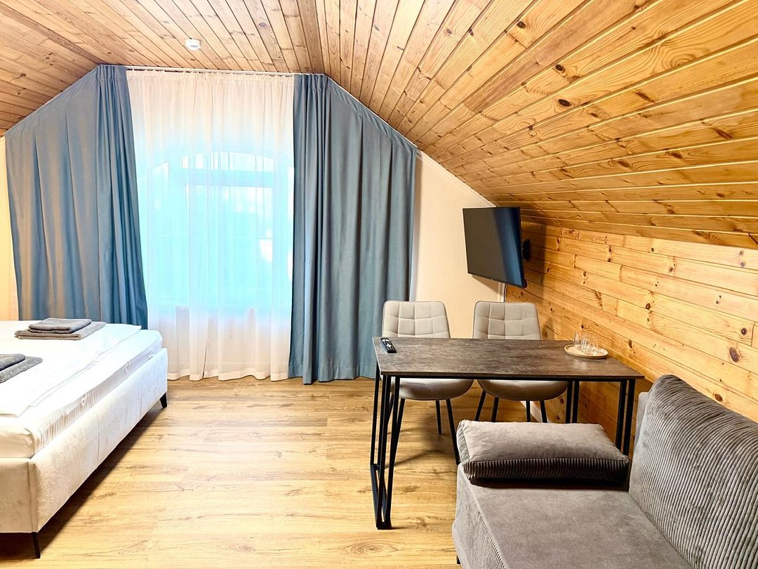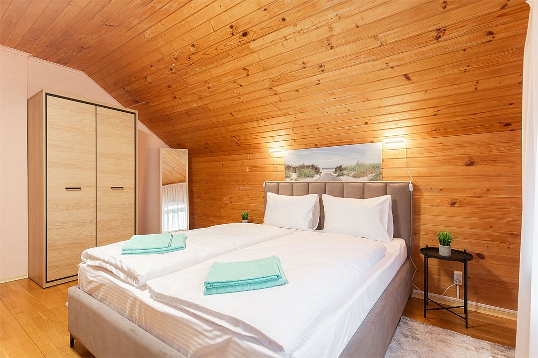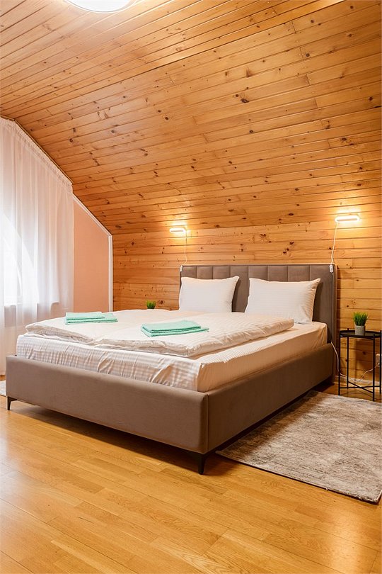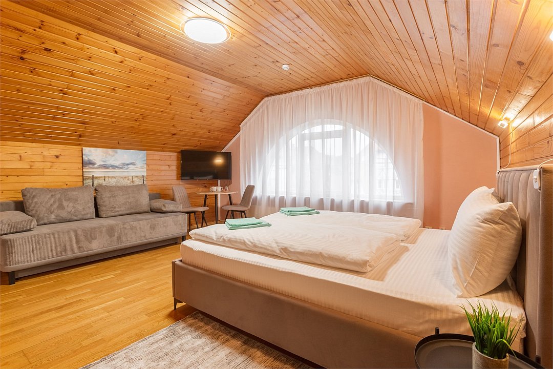 Просторный номер с естественным светом благодаря большим мансардным окнам, предлагает уютную обстановку для незабываемого отдыха в национальном парке «Куршская коса». Мансарда оснащена двуспальной кроватью 200*160 с ортопедическим матрасом, раскладным диваном и предназначены для размещения 4-х гостей с возможностью дополнительного предоставления комфортной раскладной кровати в количестве 1 шт. за доп. плату. В номере также предусмотрена ванная комната с душевой кабиной, феном и набором туалетных принадлежностей. Гости могут воспользоваться бесплатным Wi-Fi, телевизором. Для удобства имеется мини-холодильник и электрический чайник с набором для приготовления чая и кофе. Предусмотрена уборка номера и смена полотенец. По запросу предоставляются дополнительные услуги, такие как гладильные услуги, питание: завтра, обед и ужин. Номер идеально подходит для путешествий с семьей.Услуги и удобства