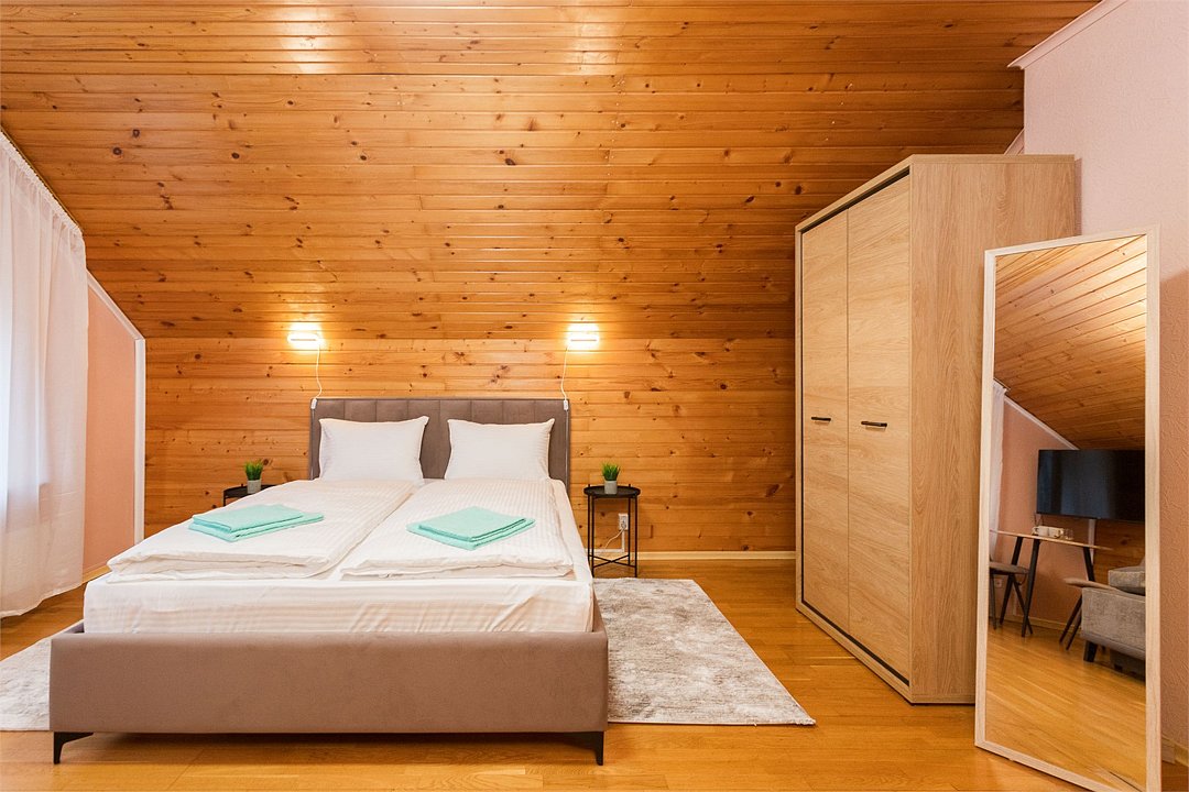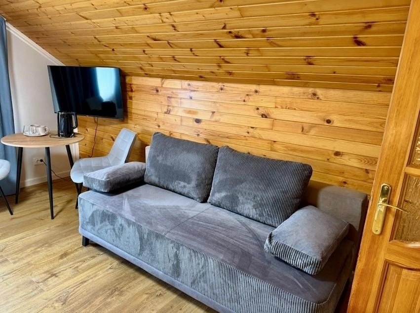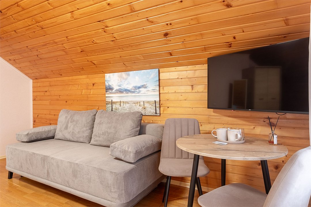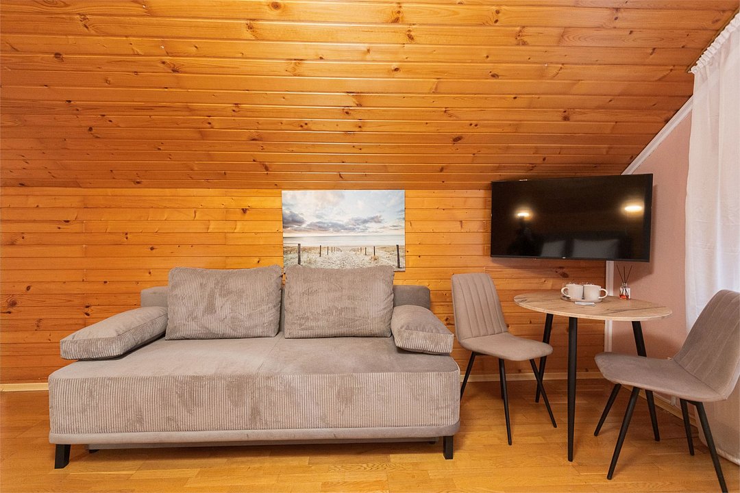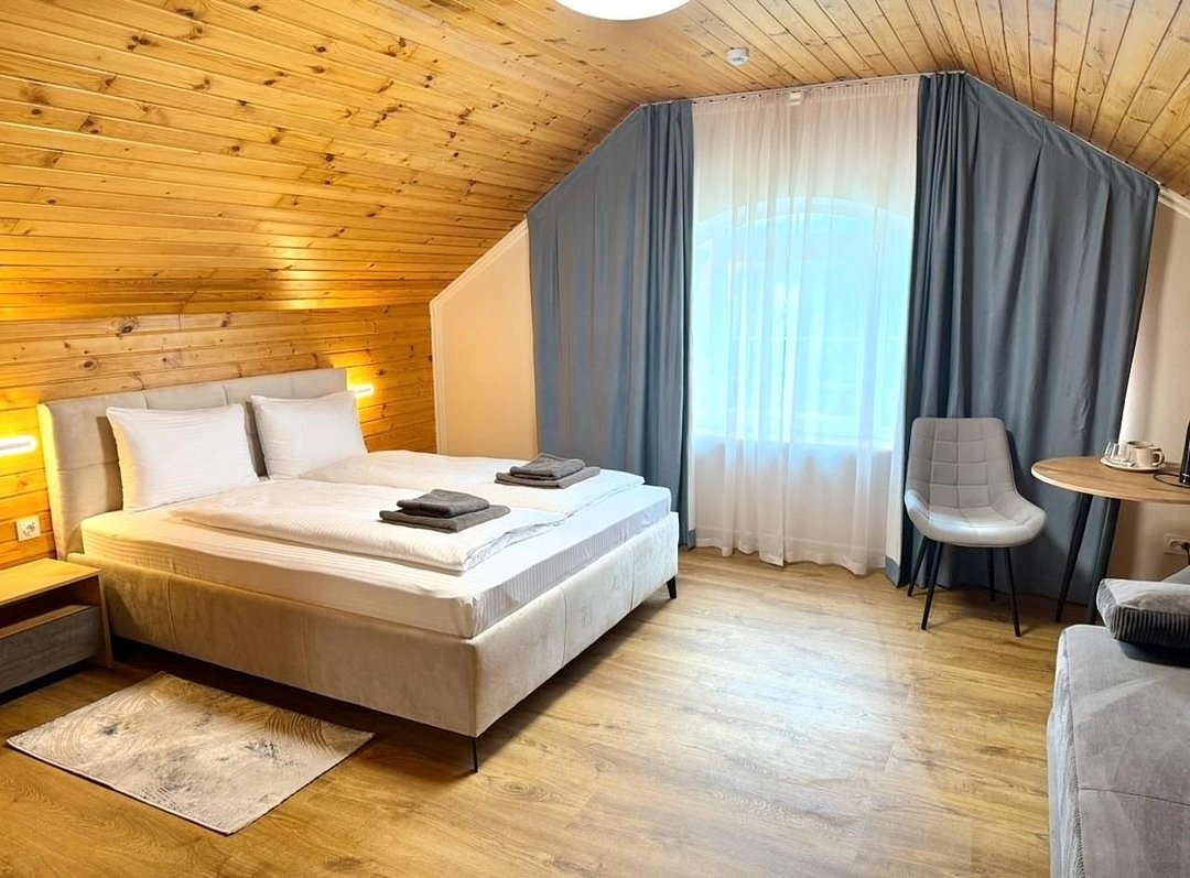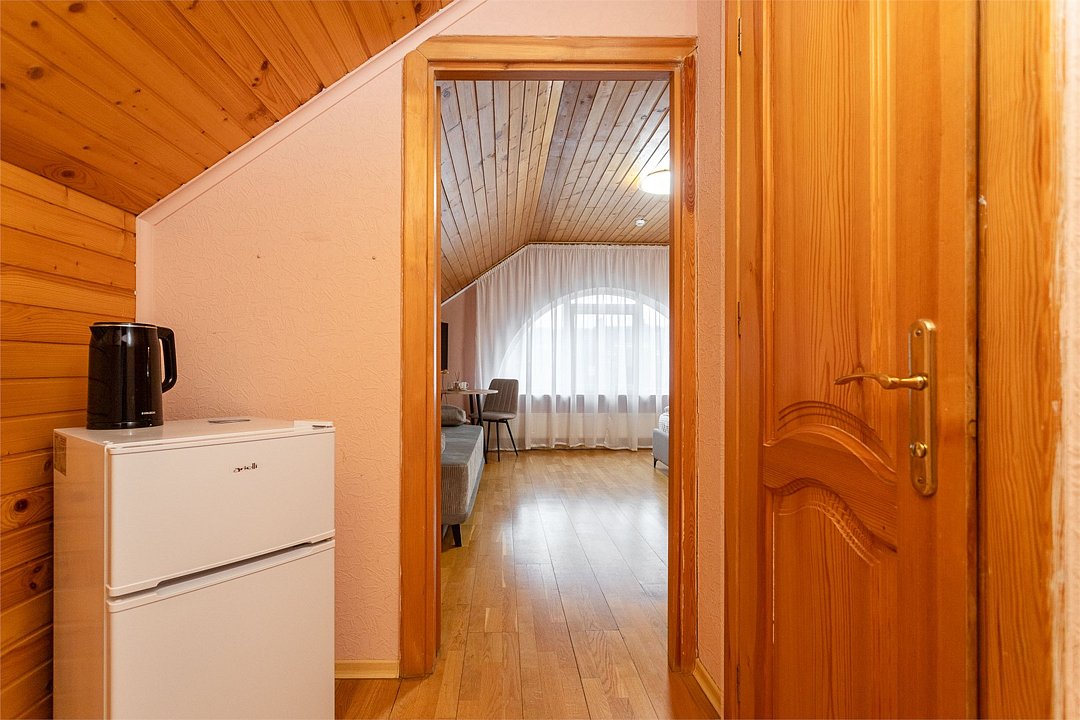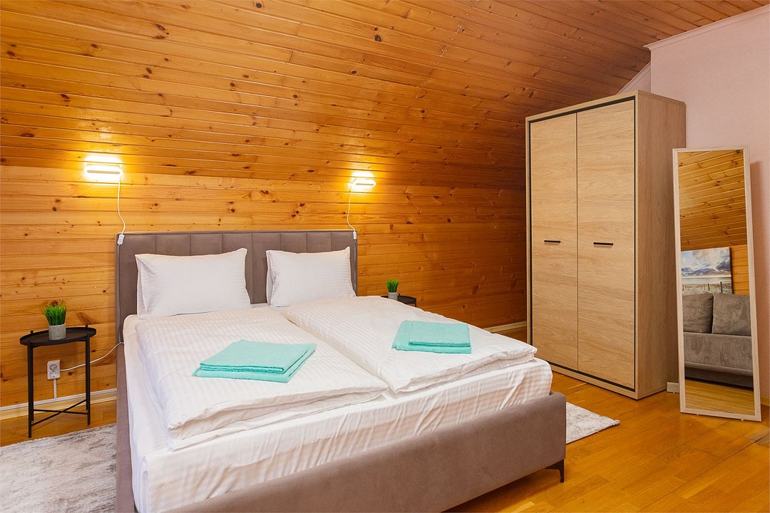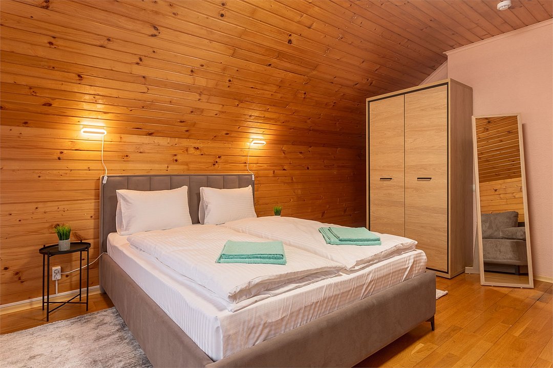 Просторный номер с естественным светом благодаря большим мансардным окнам, предлагает уютную обстановку для незабываемого отдыха в национальном парке «Куршская коса». Мансарда оснащена двуспальной кроватью 200*160 с ортопедическим матрасом, раскладным диваном и предназначены для размещения 4-х гостей с возможностью дополнительного предоставления комфортной раскладной кровати в количестве 1 шт. за доп. плату. В номере также предусмотрена ванная комната с душевой кабиной, феном и набором туалетных принадлежностей. Гости могут воспользоваться бесплатным Wi-Fi, телевизором. Для удобства имеется мини-холодильник и электрический чайник с набором для приготовления чая и кофе. Предусмотрена уборка номера и смена полотенец. По запросу предоставляются дополнительные услуги, такие как гладильные услуги, питание: завтра, обед и ужин. Номер идеально подходит для путешествий с семьей.Услуги и удобства