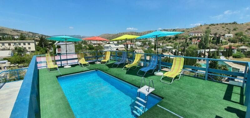 Уютный номер с балконом, все удобства, во дворе большой бассейн с горкой, где дети любят играть.