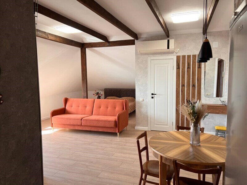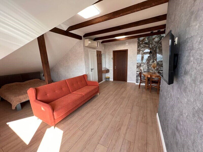 К проживанию представлен трехместный номер с двуспальной кроватью, раскладным диваном, шкафом и комодом для хранения вещей, а также кондиционером и телевизором.