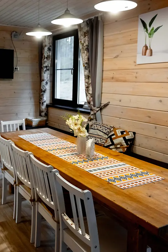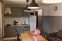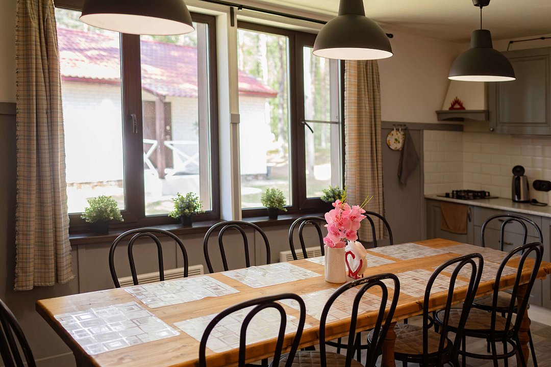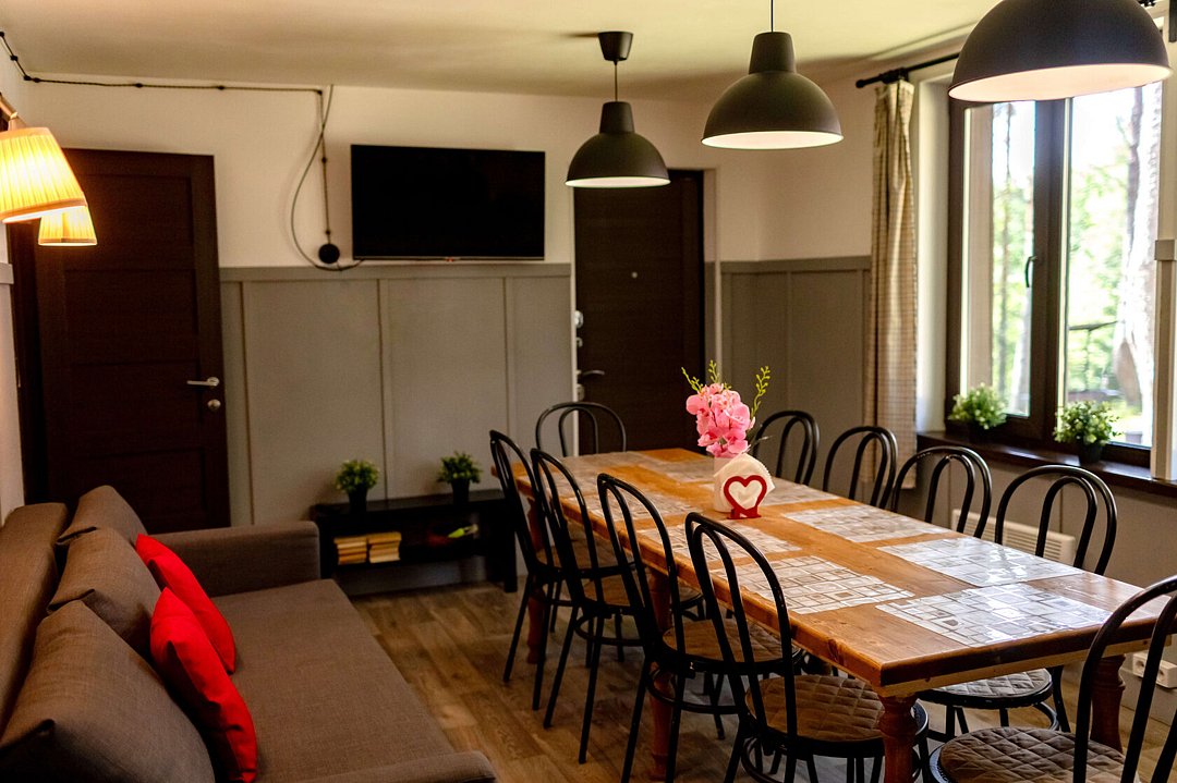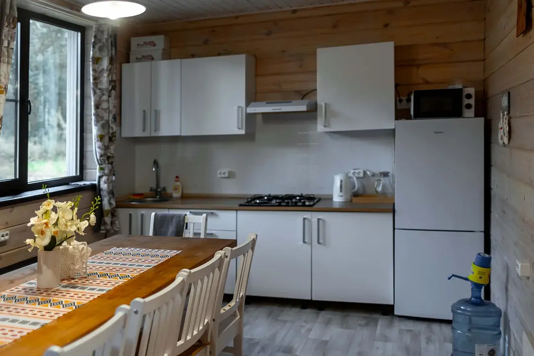 - большая кухня-гостиная (TV, вместительный обеденный стол, холодильник, газовая плита, микроволновка, набор посуды);