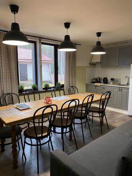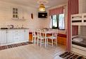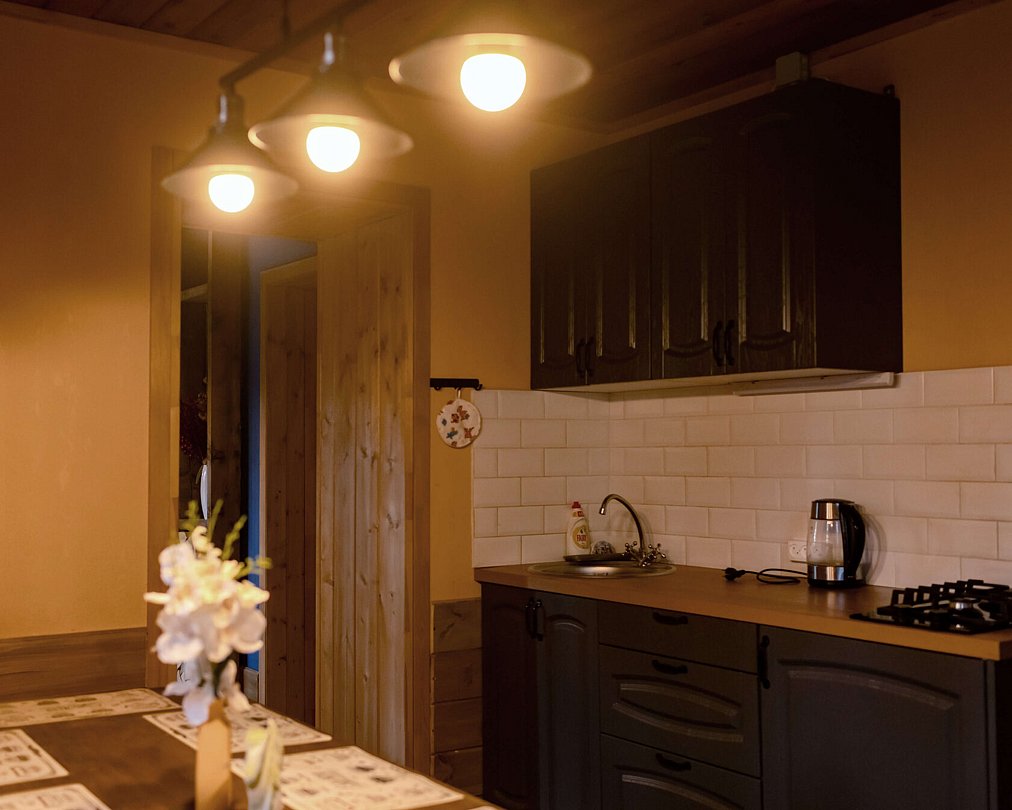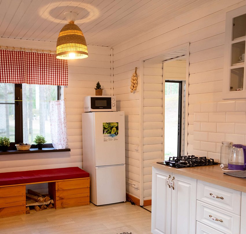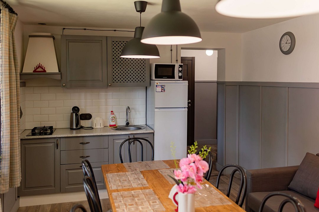 - большая кухня-гостиная с двуспальным диваном (TV, вместительный обеденный стол, диван, холодильник, газовая плита, микроволновка, набор посуды);