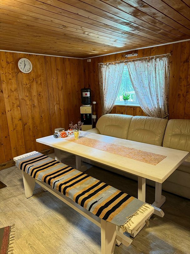 - большая кухня-гостиная (TV, вместительный обеденный стол, диван, холодильник, газовая плита, микроволновка, набор посуды);