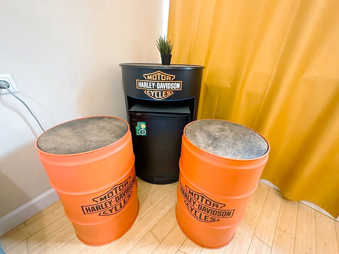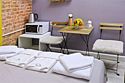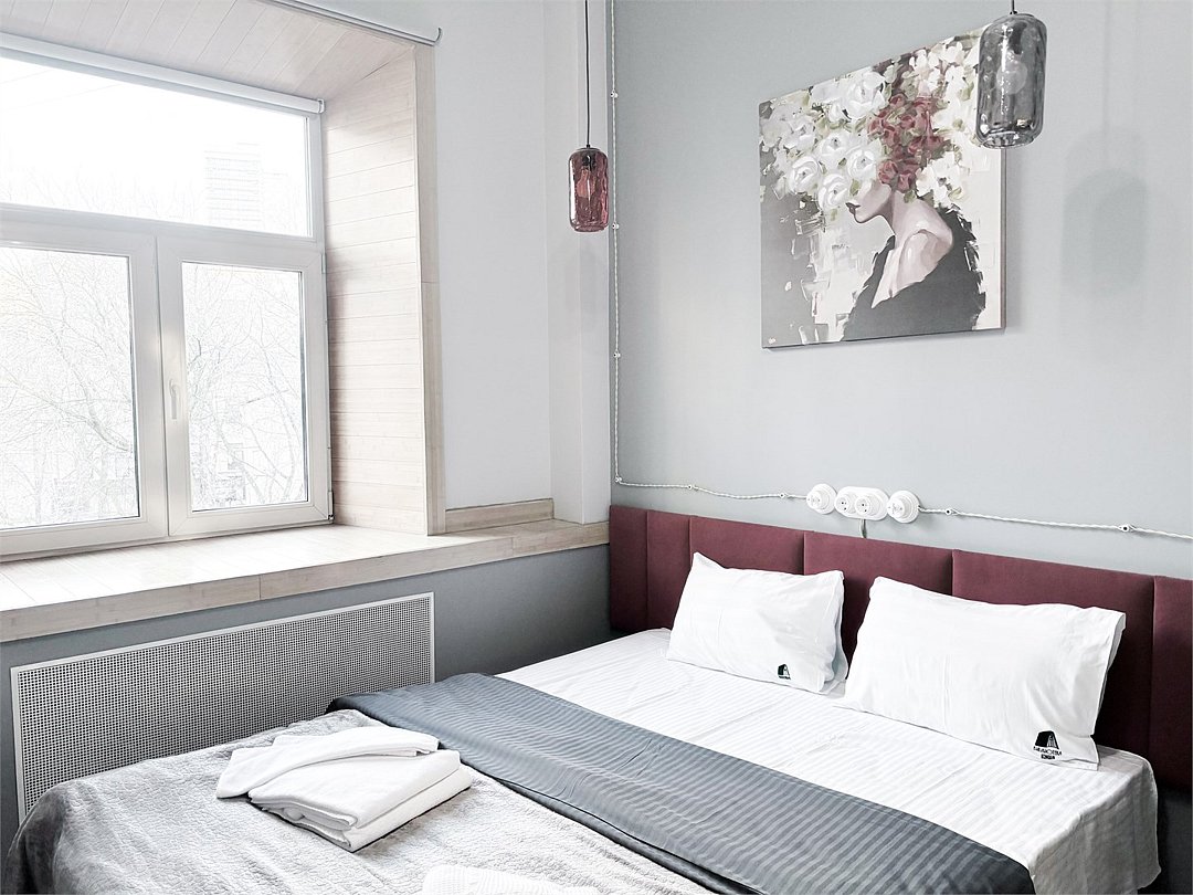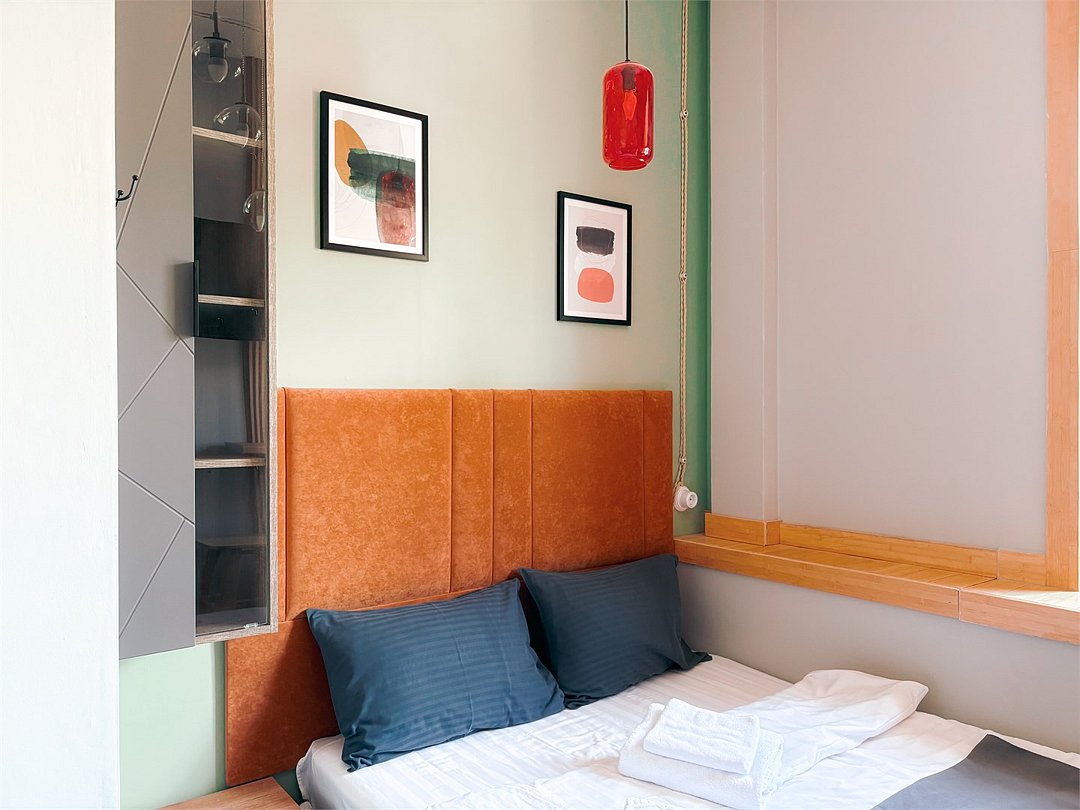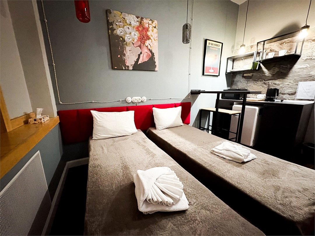 Современная и уютная комната с лаконичным дизайном. Интерьер оформлен в спокойных тонах, создавая атмосферу спокойствия и уюта. Картины на стенах придают помещению художественный акцент. Большие окна обеспечивают хорошее естественное освещение. Пространство организовано функционально, что делает пребывание максимально комфортным. Оснащение: • Удобные односпальные кровати • Небольшая кухня с микроволновой печью • Холодильник • Высокие табуреты и барная стойка • Чайник и посуда • Полки для хранения вещей • Большое окно • Декоративные светильники • Душевая кабина • ТуалетУслуги и удобства
