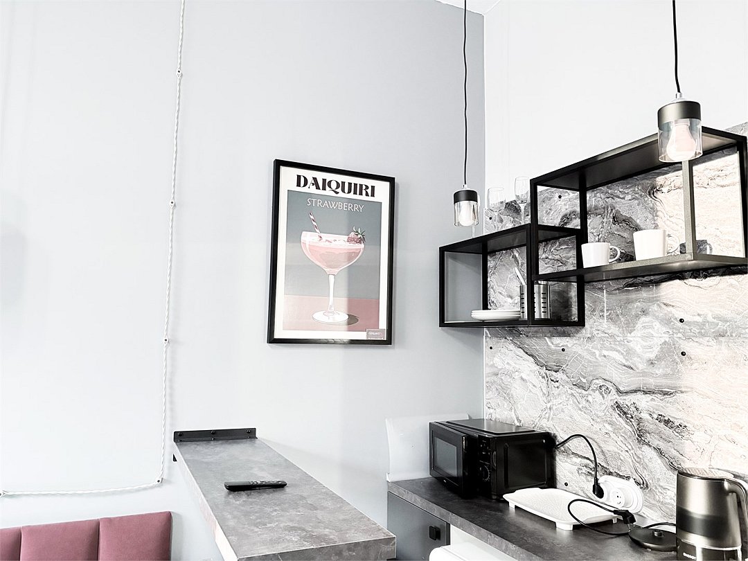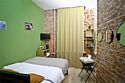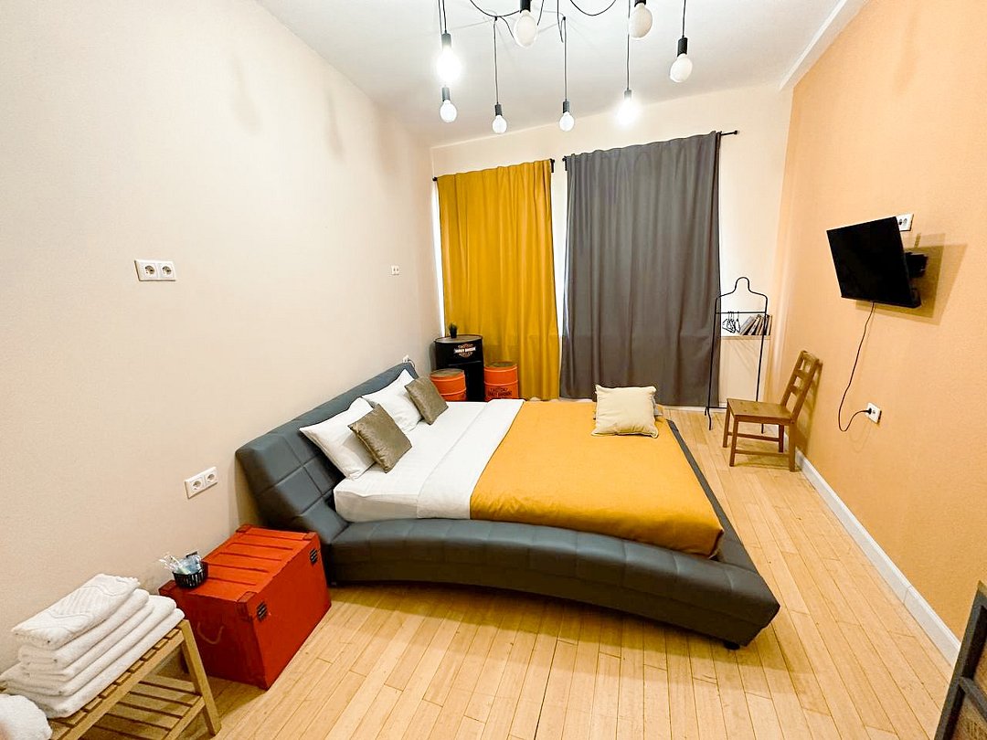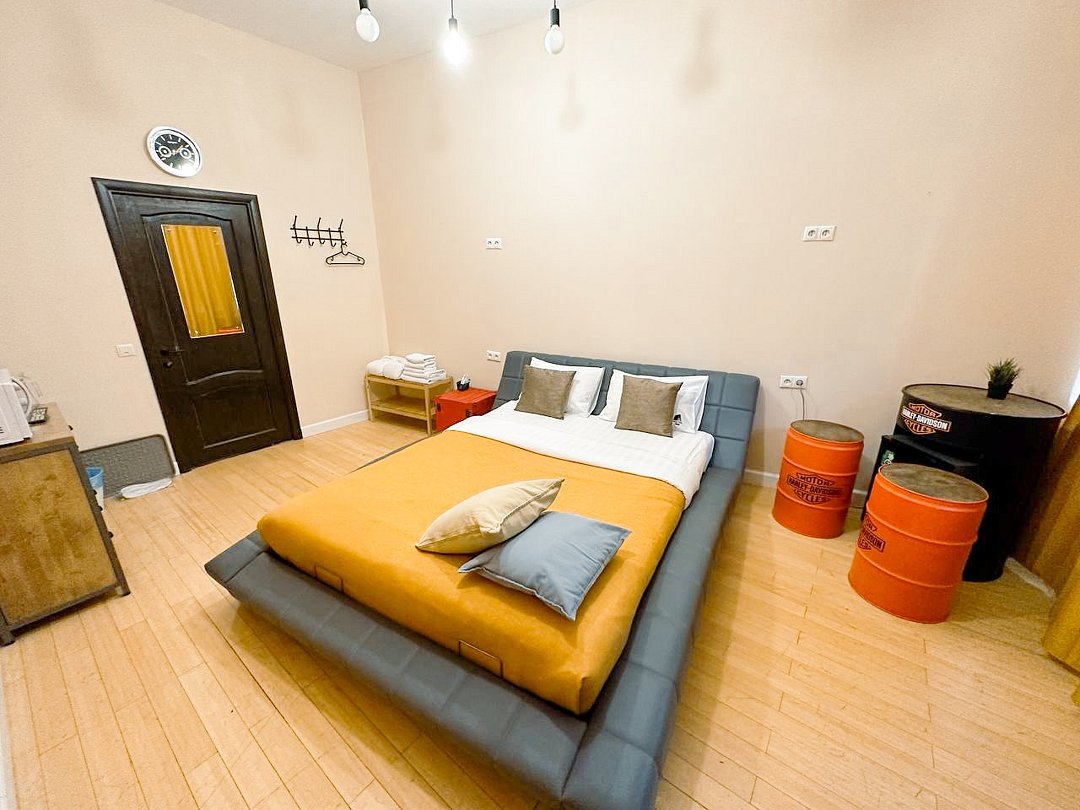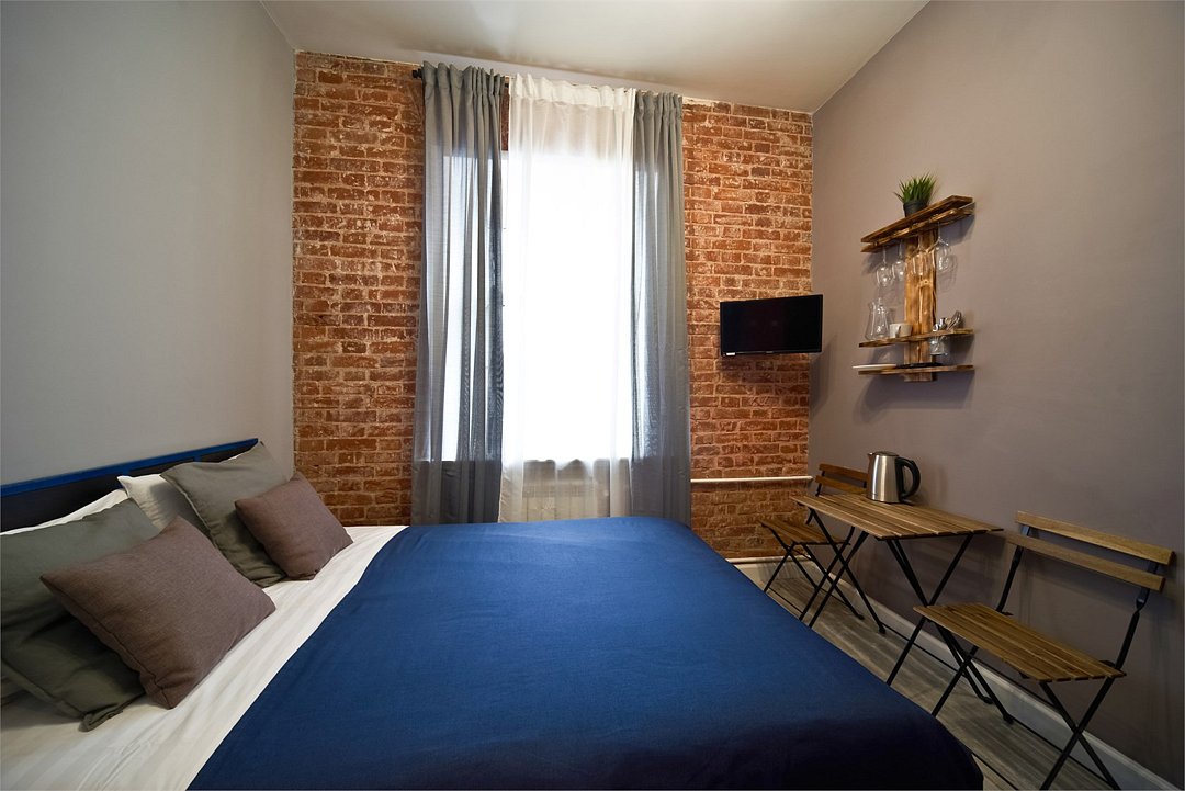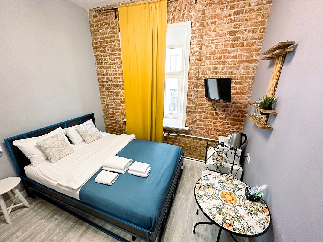 Эта уютная комната сочетает в себе стильный дизайн и функциональность. Кирпичные стены придают интерьеру особый шарм, а яркие акценты в виде подушек и штор создают атмосферу уюта. Оснащение: • Двуспальная кровать • Телевизор • Микроволновая печь • Электрочайник • Холодильник • Набор столовых приборов и посуды • Небольшой стол с двумя стульями • Полотенца и постельные принадлежностиУслуги и удобства