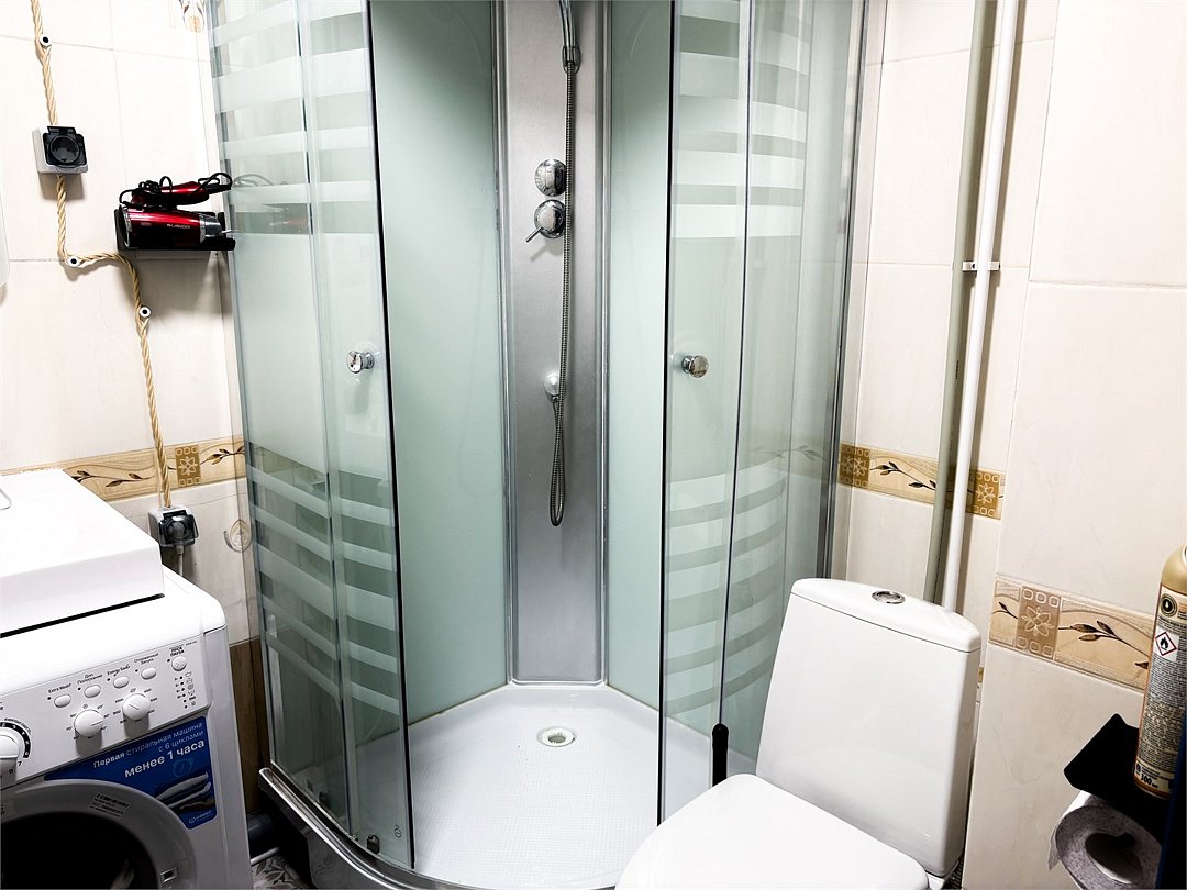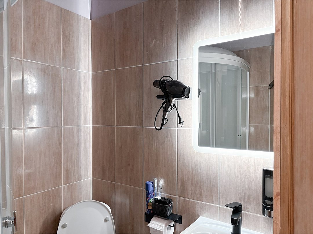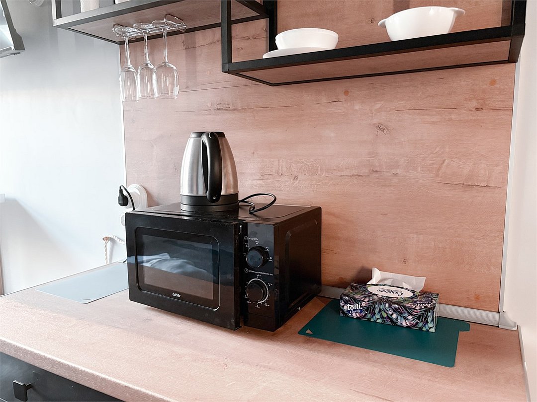 Wi-Fi, фен, микроволновая печь, душевая кабина, санузел, банные полотенца, тапочки, две односпальные кровати, стулья, вешалки, барная стойка, стиральная машина, чайник, раковина, отопление, вид на город, кулер на этаже, туалетные средства, туалет, телевизор с плоским экраном, мини-холодильник, кухонный уголок, система умный дом, умная колонка, без питомцевВ номере