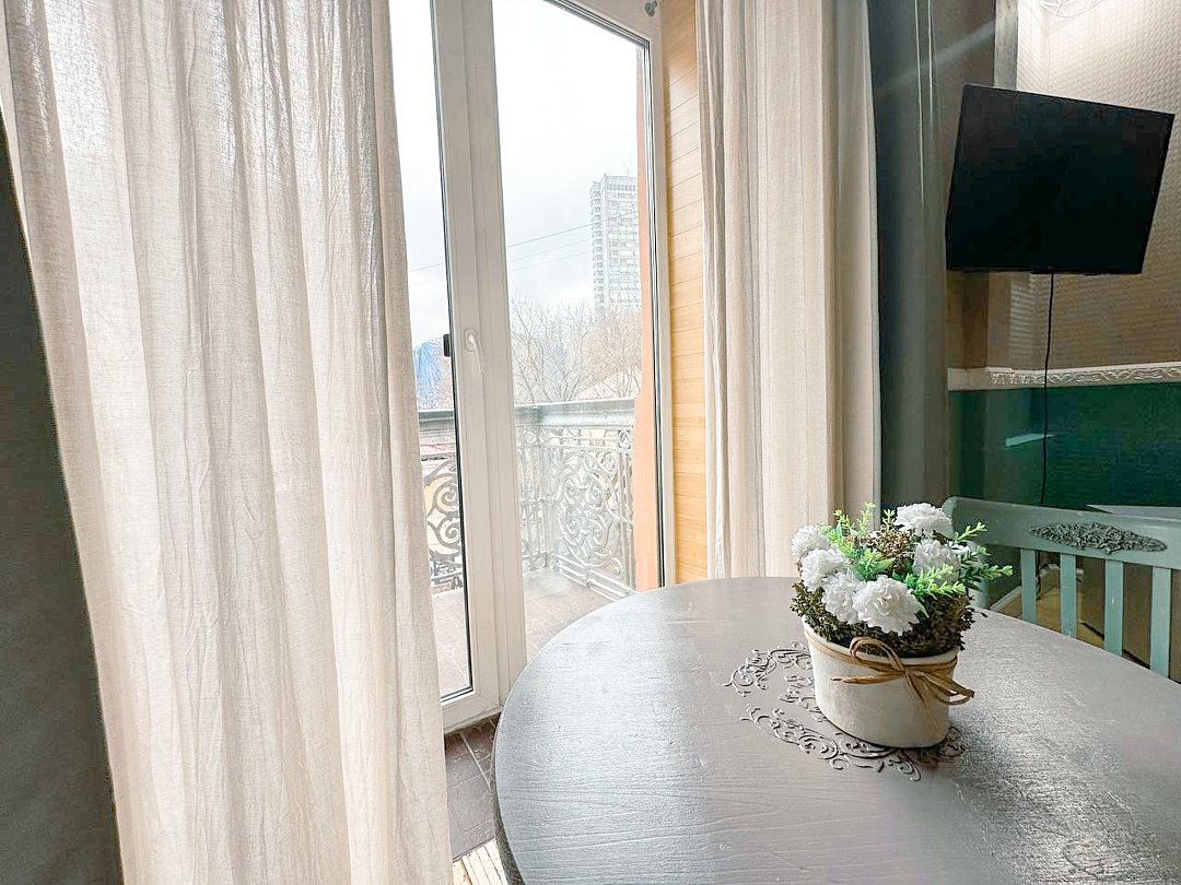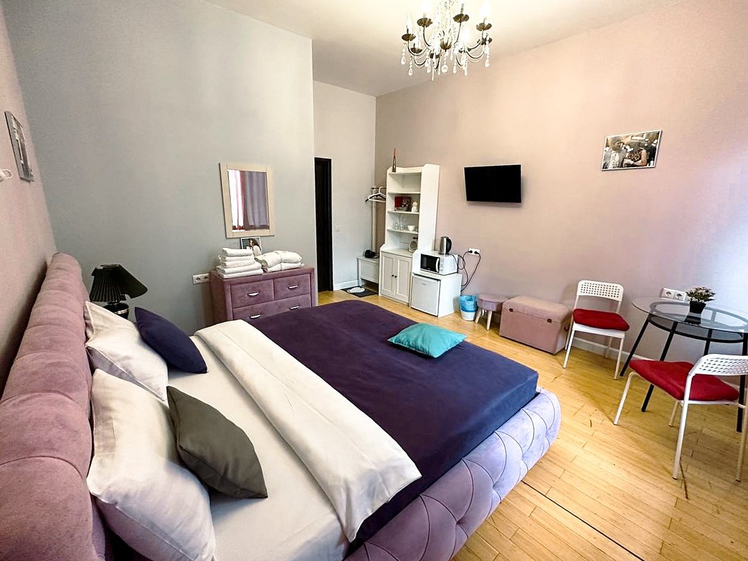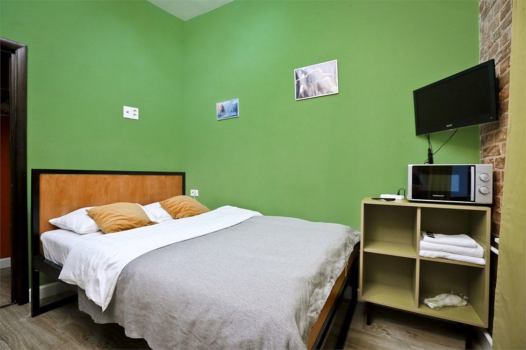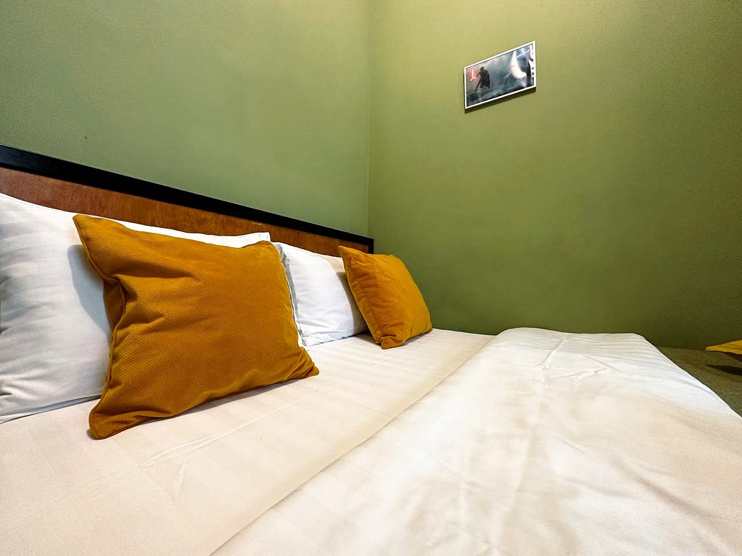 Светлая и уютная комната, выполненная в мягких тонах, дарит атмосферу расслабления. Просторное окно наполняет помещение естественным светом, создавая ощущение простора. Современное оснащение и изящный декор добавляют комфорт. Оснащение номера: • Двуспальная кровать • ЖК-телевизор • Комод • Зеркало в полный рост • Санузел с душевой кабинкой • Компактная кухня с мойкой • Микроволновая печь • Электрический чайник • Обеденная зонаУслуги и удобства