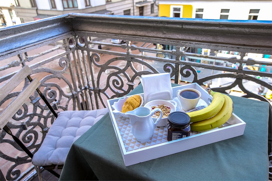 телевизор, Wi-Fi, микроволновая печь, ванна или душевая кабина, санузел, банные полотенца, тапочки, балкон с красивым видом, двуспальная кровать, стулья, зеркало, комод, набор посуды, чайник, вид на город, кулер на этаже, стаканы, кухонная утварь, стол, туалет, мини-холодильник, без питомцевВ номере