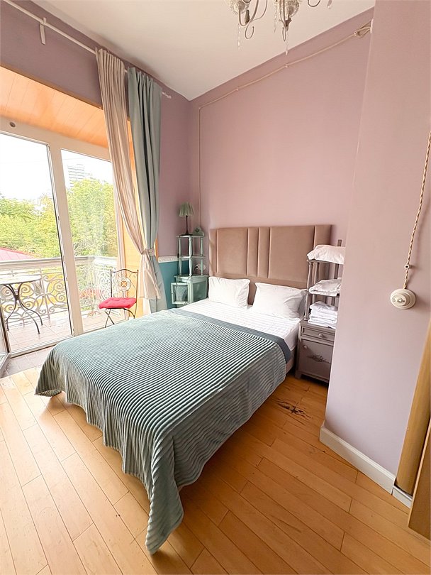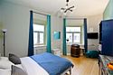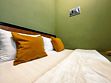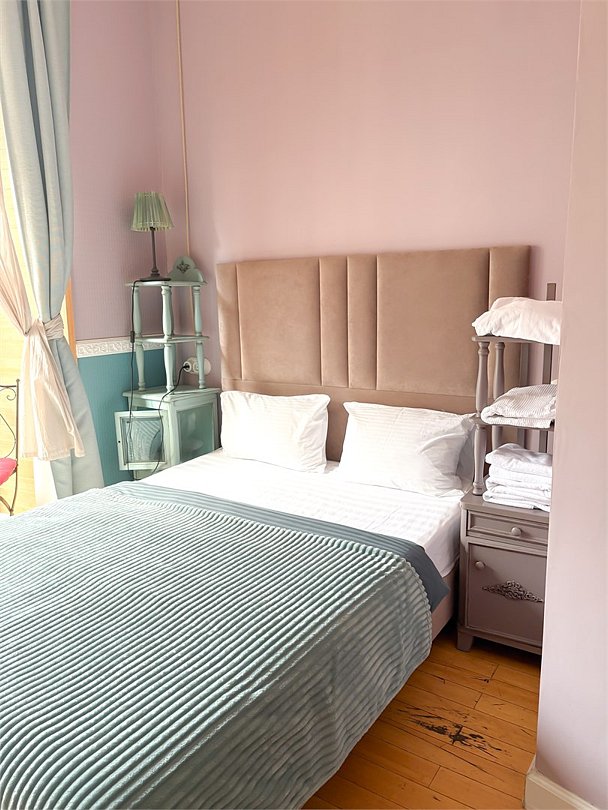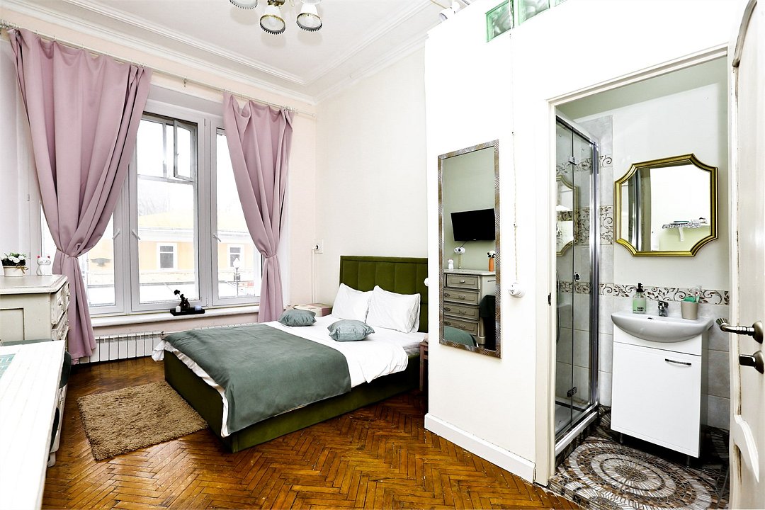 Просторная комната оформлена в мягких зелёных тонах, создающих атмосферу уюта и комфорта. Большое окно наполняет комнату естественным светом. Интерьер дополняет изящная двуспальная кровать и вместительная зона отдыха с современным телевизором. Гармонично вписываются элементы старинного декора. Оснащение: • Двуспальная кровать • Большой телевизор • Электрический камин • Микроволновая печь • Небольшой круглый стол и стулья • Шкафы и полки для хранения вещей • Душевая кабина • ТуалетУслуги и удобства
