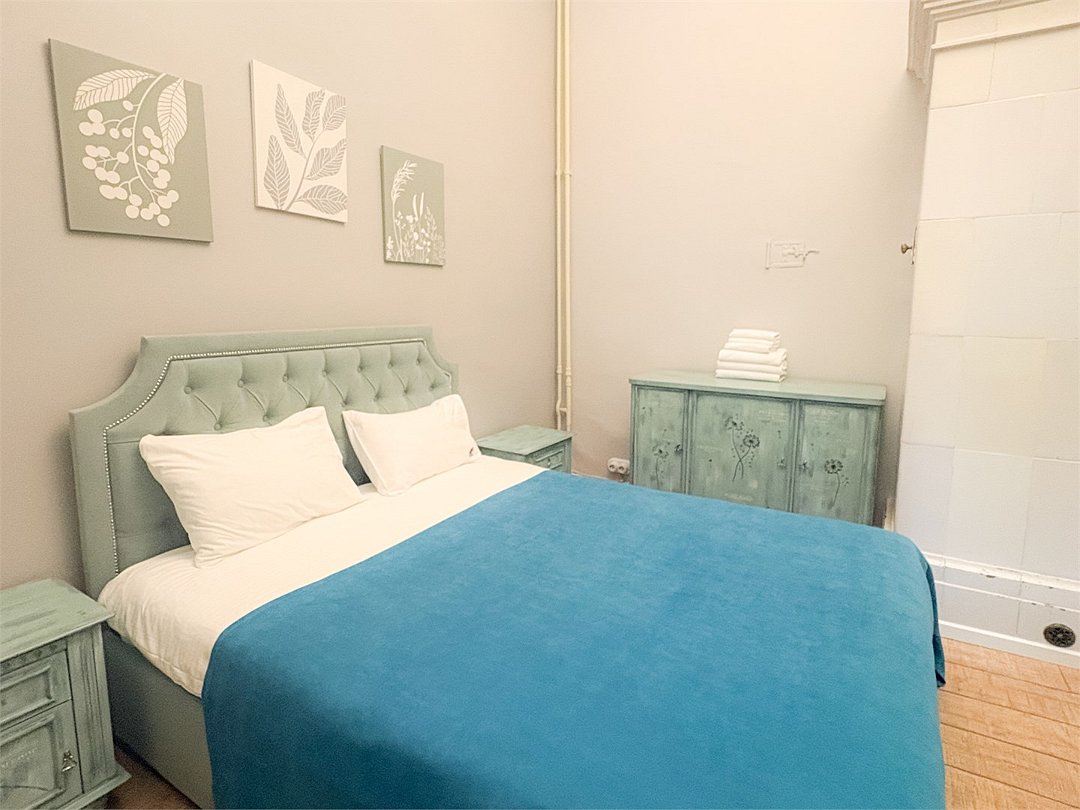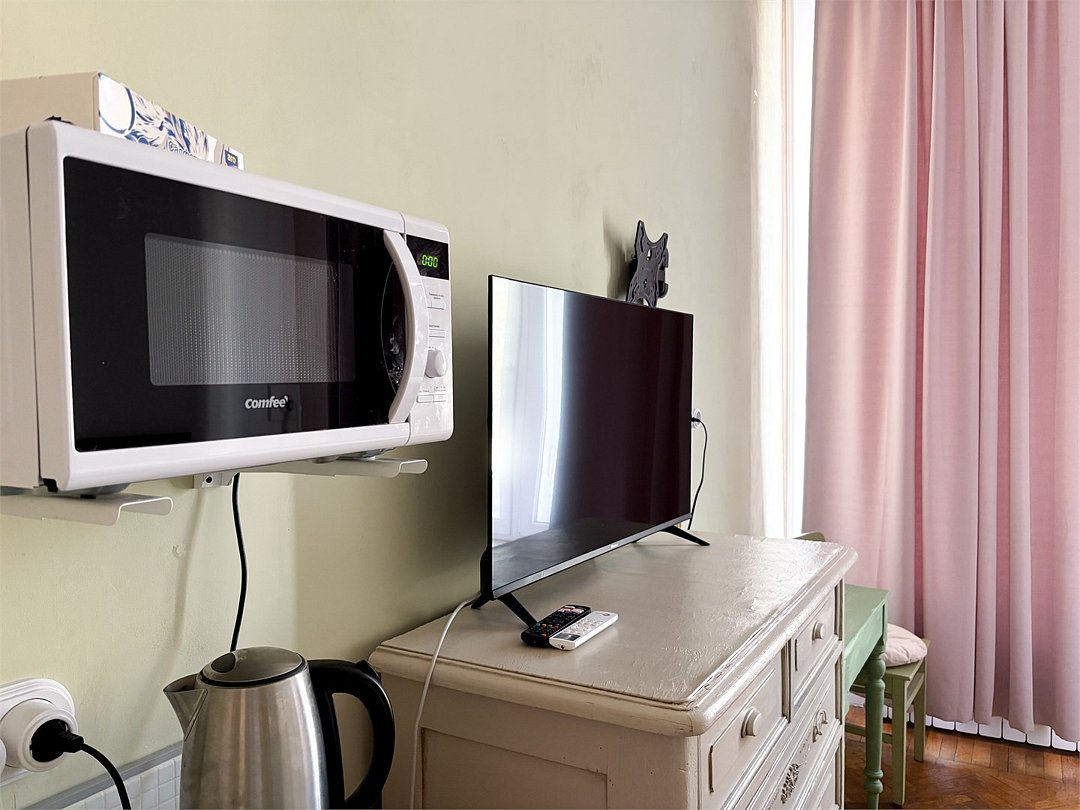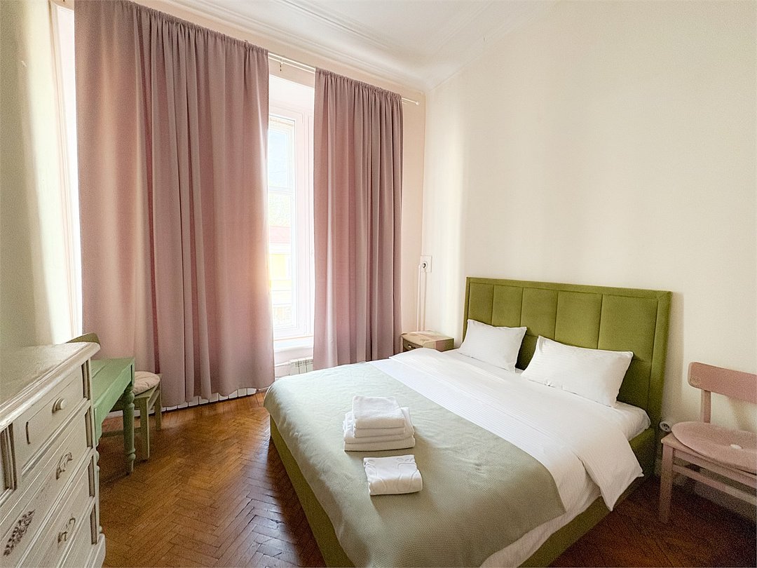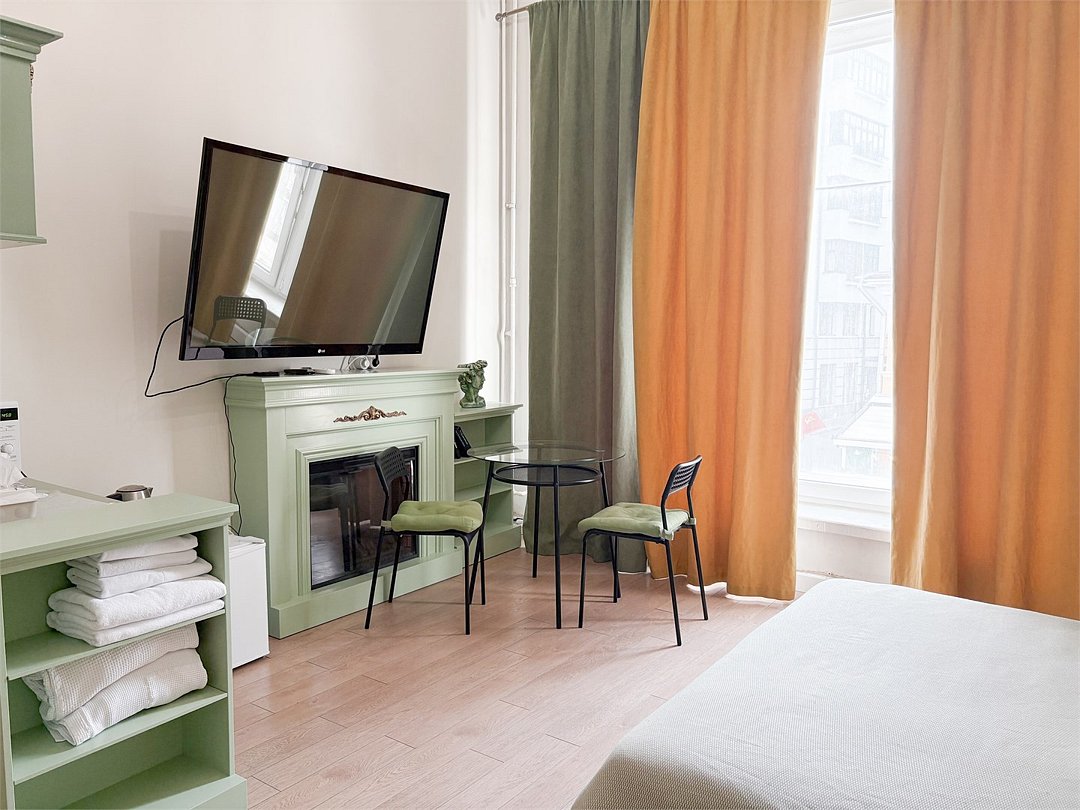 Уютная квартира оформлена в мягких зелёных оттенках, создающих атмосферу тепла и комфорта. Просторное окно заливает помещение естественным светом. Интерьер гармонично сочетает современные удобства и элементы старинного декора, включая элегантную двуспальную кровать и стильную зону отдыха с большим телевизором. Оснащение: • Двуспальная кровать • Большой современный телевизор • Электрический камин • Микроволновая печь • Компактный круглый стол со стульями • Просторные шкафы и полки для хранения • Душевая кабина • ТуалетУслуги и удобства
