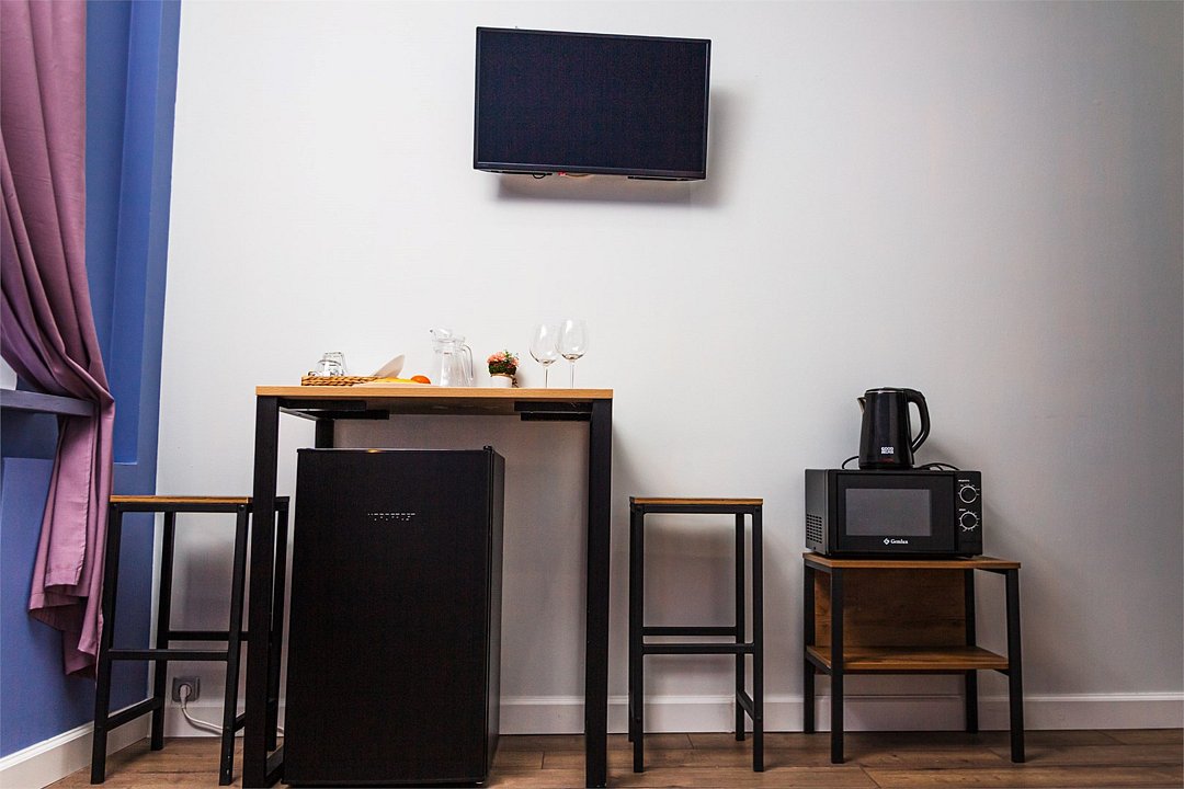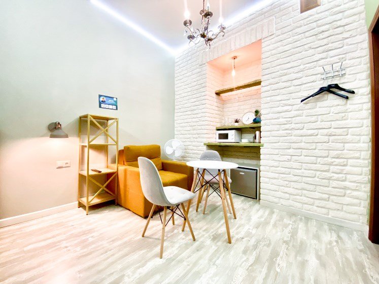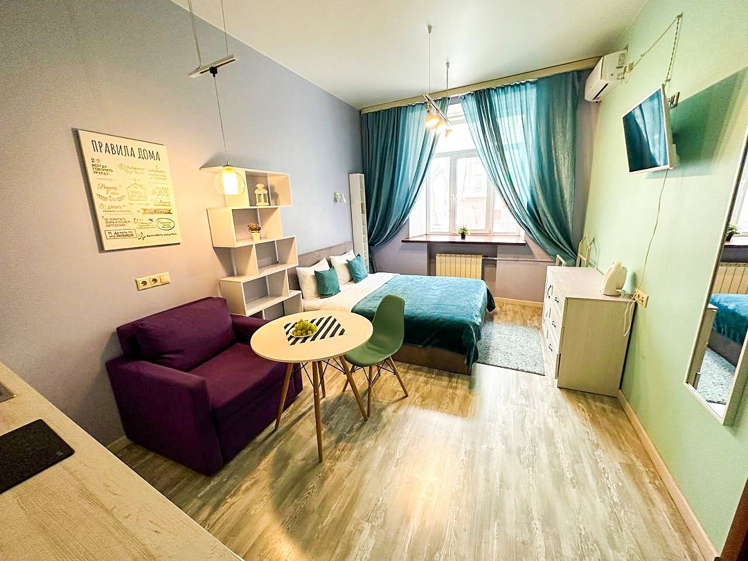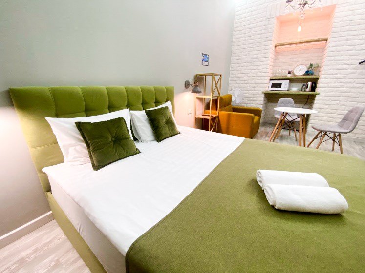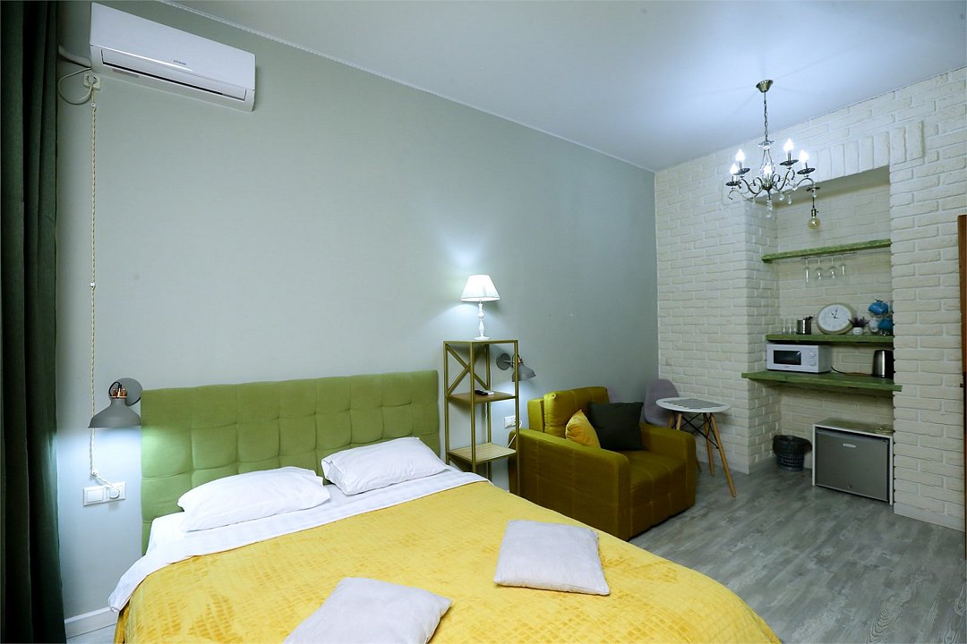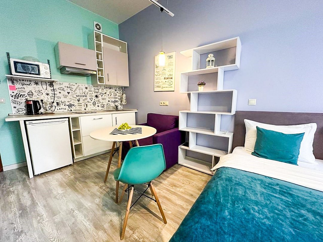 Комфортабельная студия с современным дизайном. Спальная зона оформлена в спокойных тонах. Кухня оборудована всем необходимым для приготовления еды. Ванная комната оснащена стильной душевой кабиной. Оснащение: • Двуспальная кровать • Кондиционер • Шкаф • Кухонная зона с плитой и раковиной • Микроволновая печь • Электрический чайник • Стол со стульями • Ванная комната с душевой кабиной • Тумба с раковиной и зеркалоУслуги и удобства
